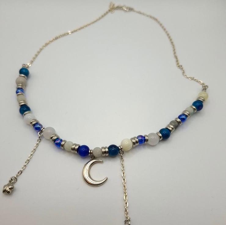 A soft blend of blue, white, and translucent beads creates a dreamy, celestial look, highlighted by a silver crescent moon charm at the centre. Tiny silver stars sit at each end for an extra touch of night sky magic. Light, pretty, and easy to wear, it’s a perfect piece for anyone who loves cosmic themed jewellery.
