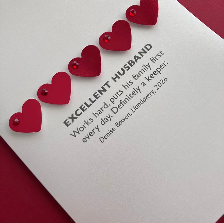 A beautiful handmade pearlescent Valentine card featuring a review about your loved one embellished with die cut metallic hearts and diamanté gems.