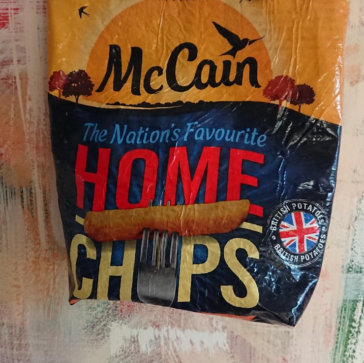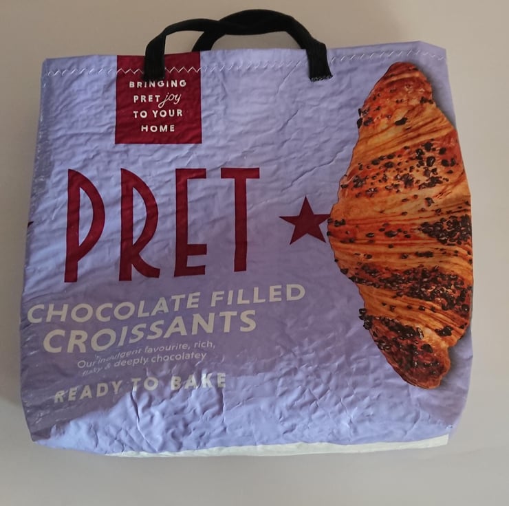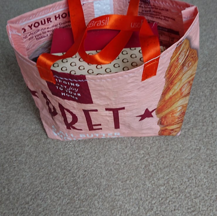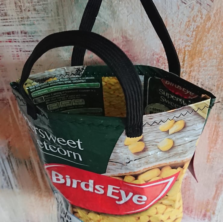 Upcycled soft packaging gift bag. Favourite frozen food, croissants, chips, sweet corn. Or commission your own favourite frozen food packaging - message me. Upcycled lanyard handles. Each bag is made from two packets. each heat sealed double for strength and sewn together. Each bag size of original packaging bag. Measurements approx 25cmx20cm x5cm. Each one varies
