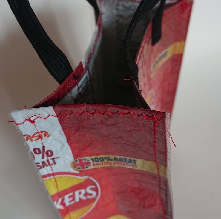 Recycled, upcycled crisp packet gift bag, reinforced with a layer of clear plastic from recycled punched pockets. Handles from unwanted lanyards. I originally used heat fused crisp packets but now add extra fused layer to make the bag more durable. Each gift bag made from 3 12 actual crisp packets which have been washed dried and heat fused flat.