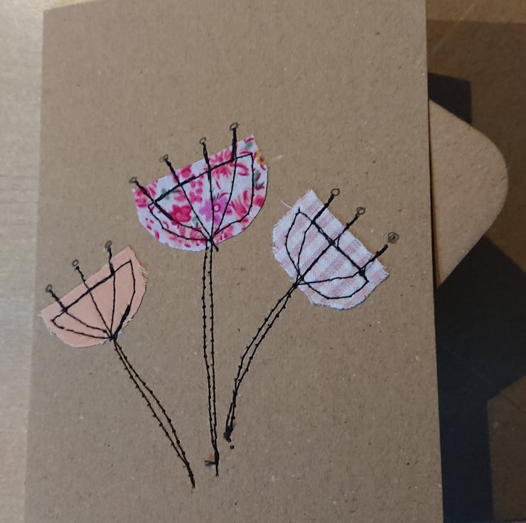 I love to sew and design unique cards using fabric. I love to use recycled materials including card and fabric. Please indicate which design and colour required and I can personalise for you within 3 days