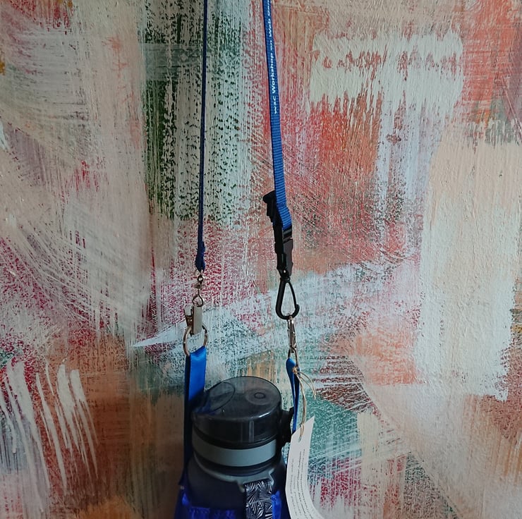 Water bottle holder made from upcycled umbrella canopy and re-used lanyard (detachable). Strong, lightweight, easy to wash and quick to dry. Great if you don't want to put water bottle in your bag/rucksack