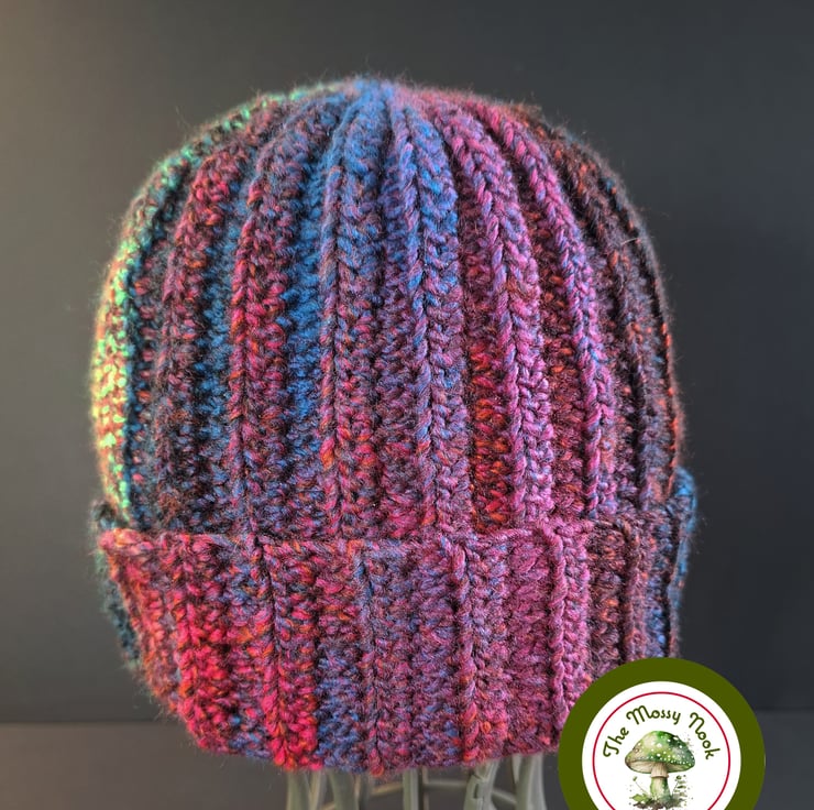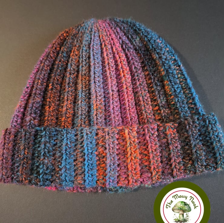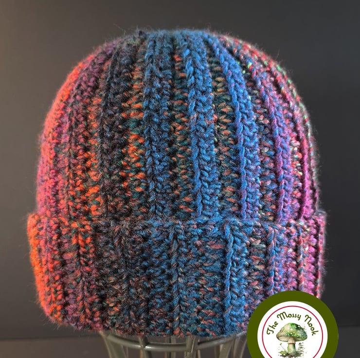 I made this ribbed beanie hat using a beautiful, self-striping variegated yarn, in the colours blue, orange, red, dark pink and black. The sizing is flexible and would fit teens, women and men.