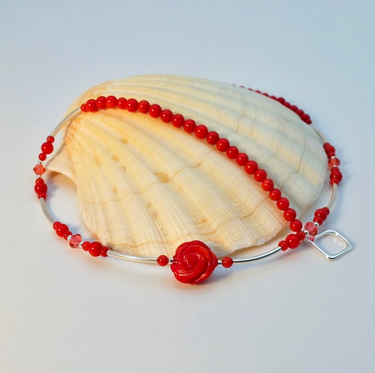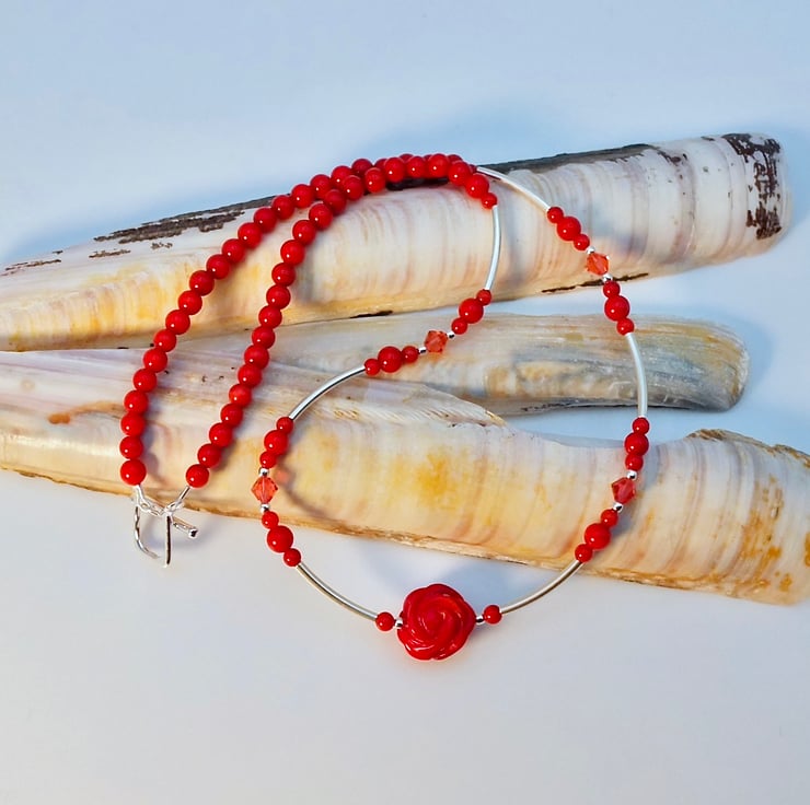 Dainty red Bamboo Coral beaded necklace featuring a 10mm carved red Bamboo Coral rose set between three 15x1.5mm sterling silver curved tubes separated with 3mm and 4mm Coral beads around a 4mm sparkly Austrian crystal bicone in the colour 'padparadscha', highlighted with 1'8mm sterling silver spacers.