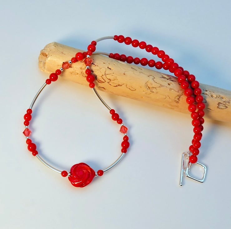 The Bamboo Coral is dyed a deep, rich red colour, the crystals are a shade lighter and slightly more pink in hue.