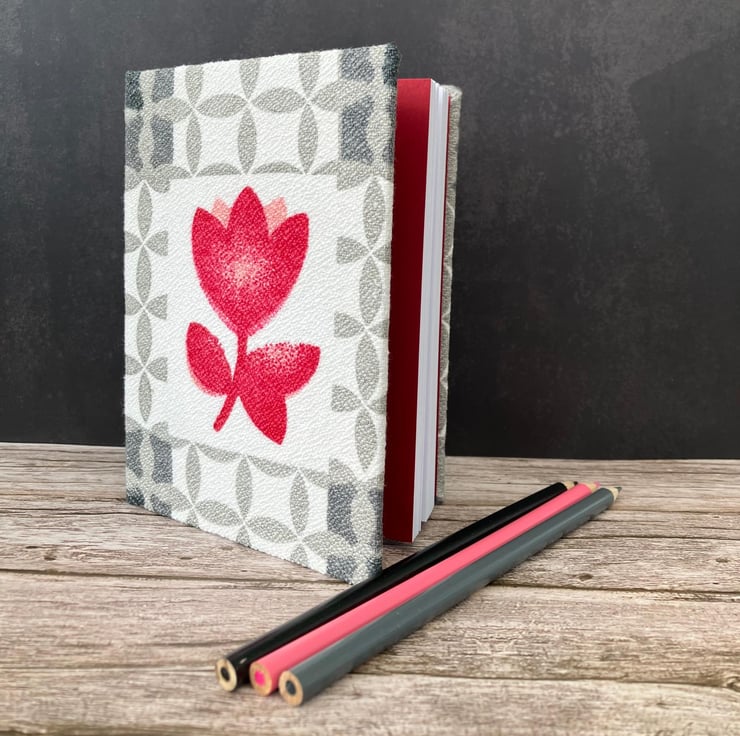 Every book I make includes a ribbon page marker, and coloured end-papers made from high quality Canford paper, hand picked to match one of the colours in the fabric design. This book has a deep red satin ribbon and matching end papers to pick out the colour of the tulips