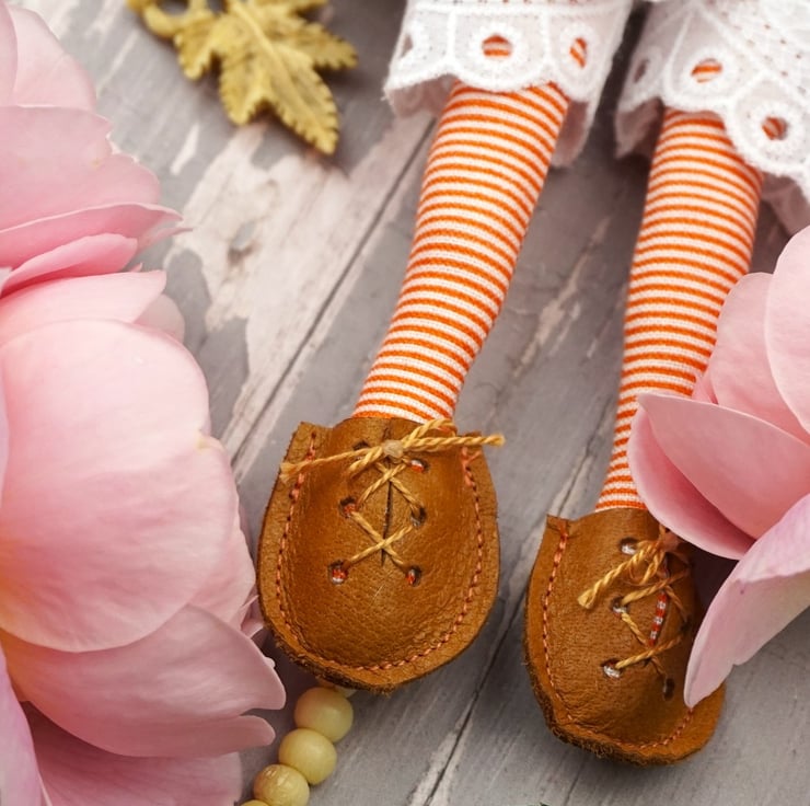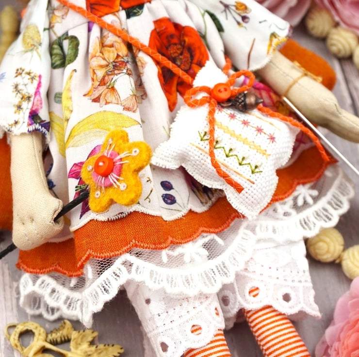This is Acorn, a perfectly imperfect doll that is older stock from last year. A smaller pattern, she is about two thirds the size of my witch and slimmer than my Fairy Godmother. This little Summer Fay has a Liberty tana lawn print dress in orange and white called Floral Eve. She has wings that match her underskirt and sports a little embroidered felt flower. Her shoes are the smallest I have ever made and are leather. She has a piece of rose quartz to her heart with rosemary in her stuffing and is finished with tiny buttons tiny ttaupe fairy antenna.