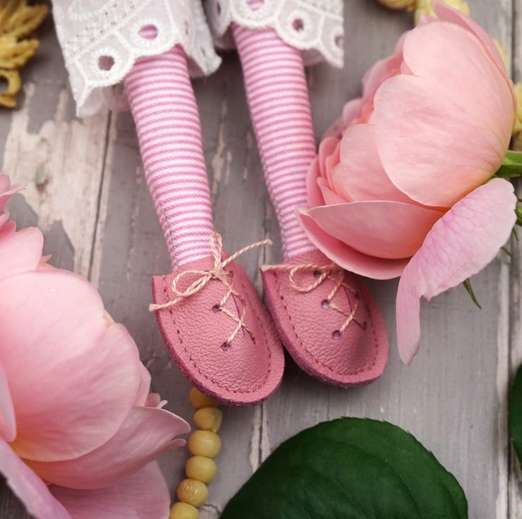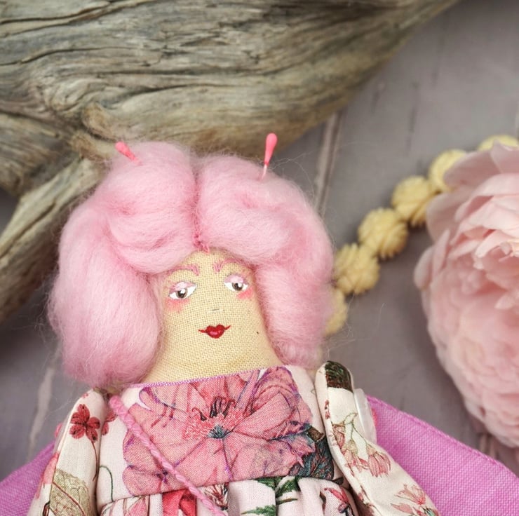 This is Lily a perfectly imperfect doll. She is old stock from last year.. A smaller pattern, she is about two thirds the size of my witch and slimmer than my Fairy Godmother. This little Summer Fay has a Liberty tana lawn print dress called Floral Eve. She has wings that match her underskirt and sports a little embroidered felt flower. Her shoes are the smallest I have ever made and are leather. She has a piece of rose quartz to her heart with rose petals in her stuffing and is finished with tiny buttons tiny pink fairy antenna.