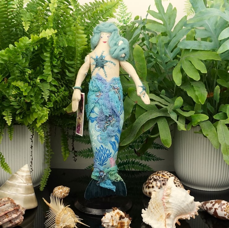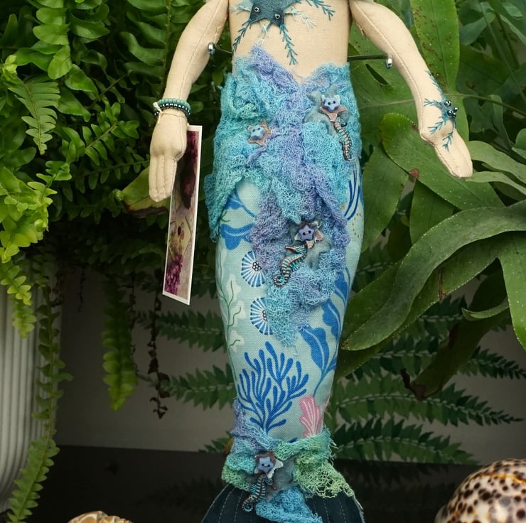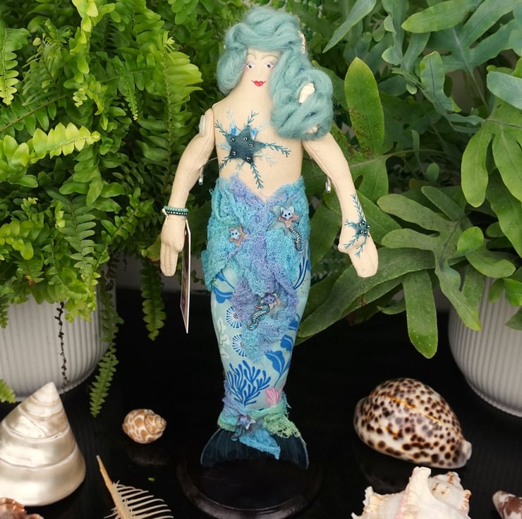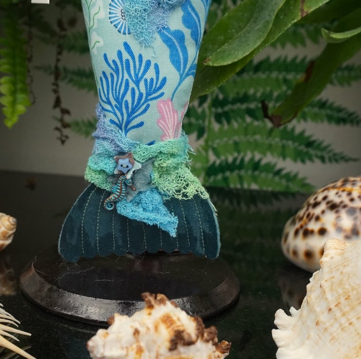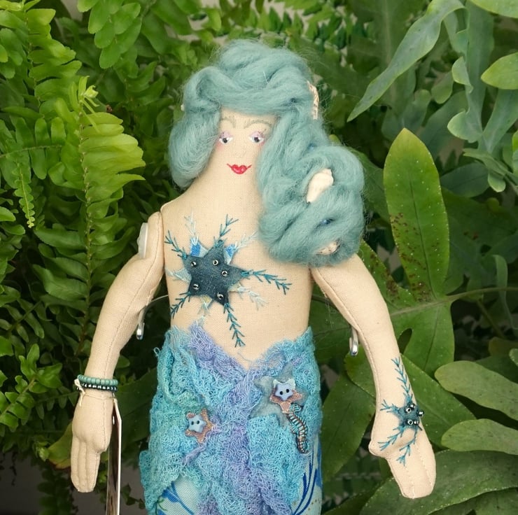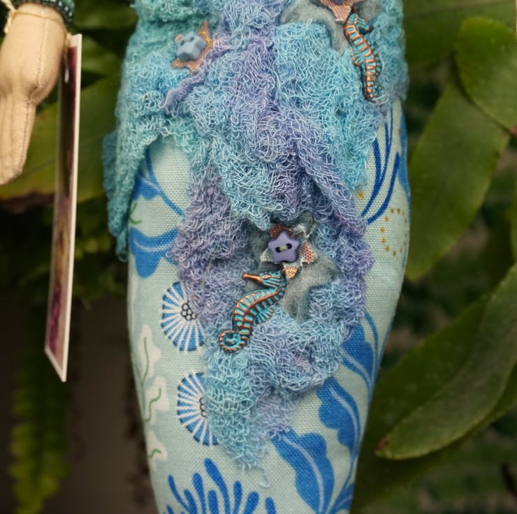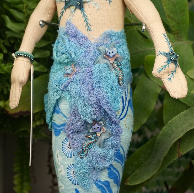 Andrasteia is a tiny mermaid, an old pattern from 2024. With silk and felt detailing accentuated with sea shell themed charms and hand dyed scrim, each mermaid has a nautical fabric tail with a silk fin. I have scoured the internet looking for sea themed fabrics that appeal to me and they make the basis of each mermaid's colouring. Each tiny mermaid has her modesty preserved with a well placed starfish, which is embroidered and the design repeats on her hand. She has tiny copper and blue sea horse charms.