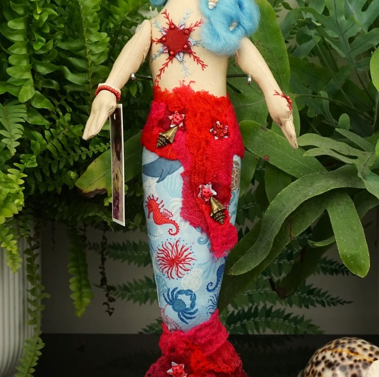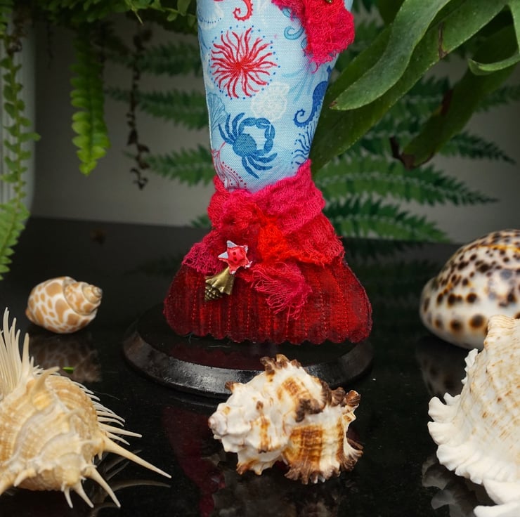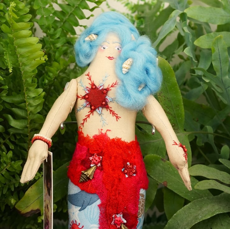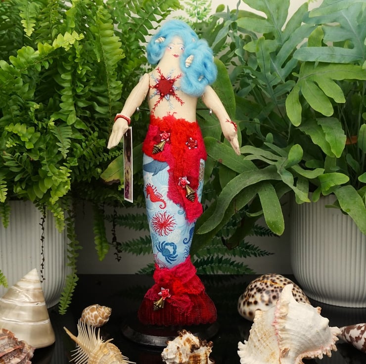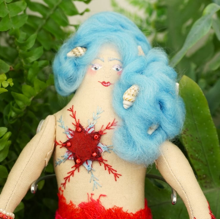 Amalthea has a red and blue theme with a tiny piece of blue sea glass to her heart and soft sky blue hair within in which are pearl beads and tiny sea shells. The scrim gives a nicely nautical twist and makes for a great additional texture. Each mermaid is named for a sea nymph from Greek mythology.