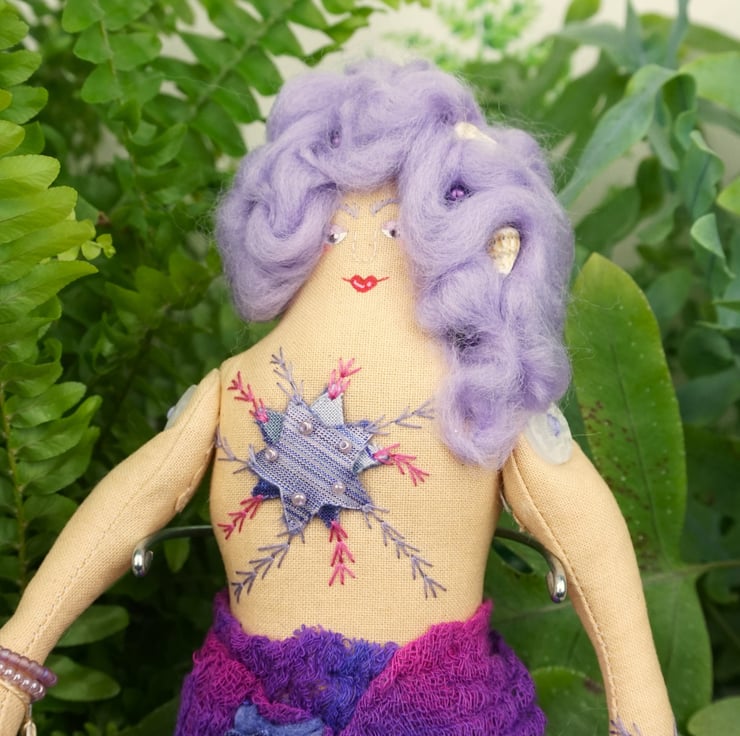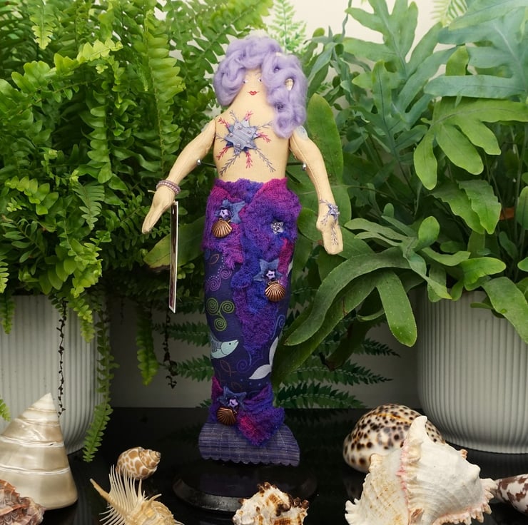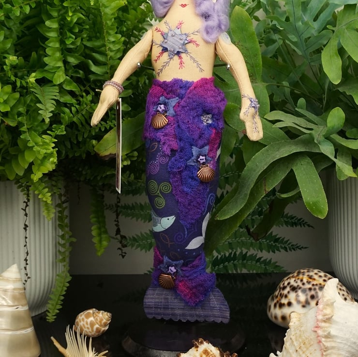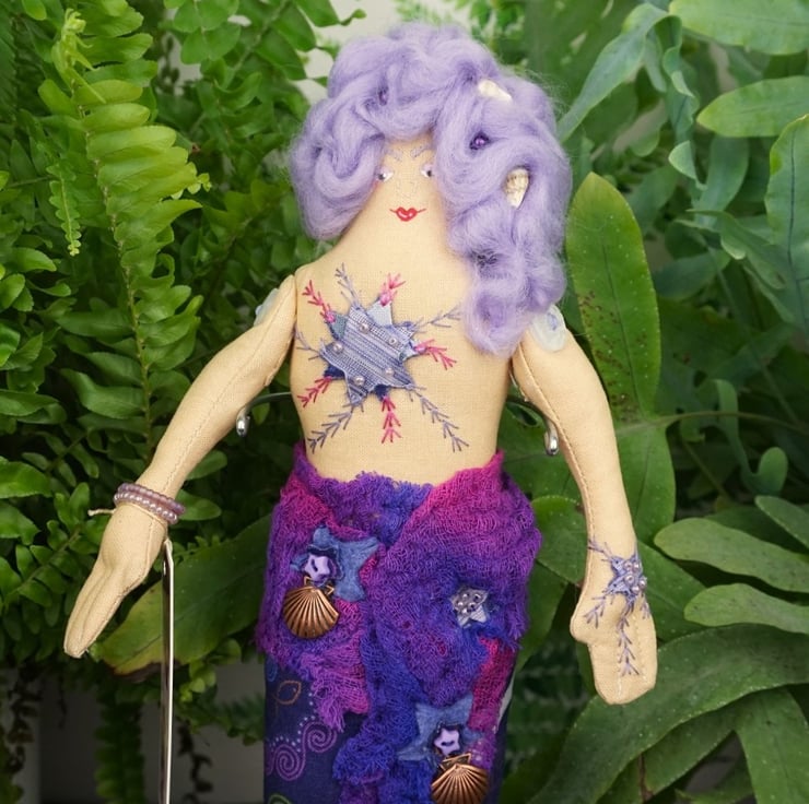 Aethra is a tiny mermaid, an old pattern from 2024. With silk and felt detailing accentuated with sea shell themed charms and hand dyed scrim, each mermaid has a nautical fabric tail with a silk fin. I have scoured the internet looking for sea themed fabrics that appeal to me and they make the basis of each mermaid's colouring. Each tiny mermaid has her modesty preserved with a well placed starfish, which is embroidered and the design repeats on her hand.