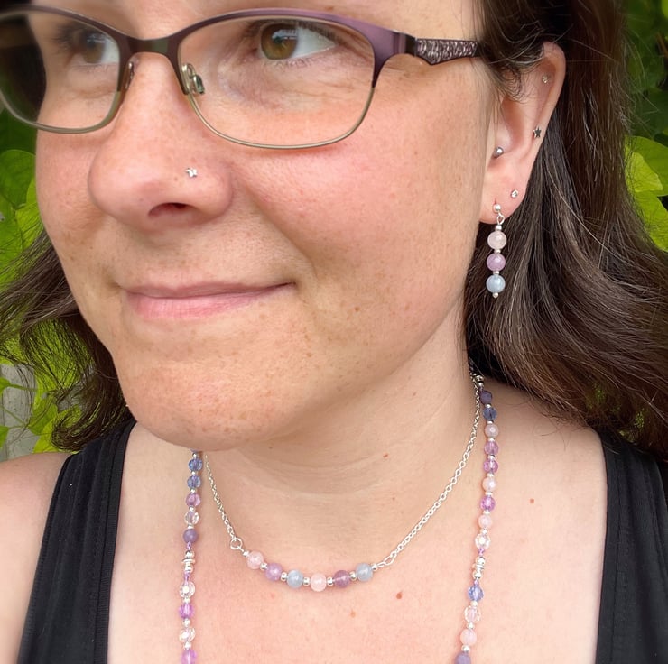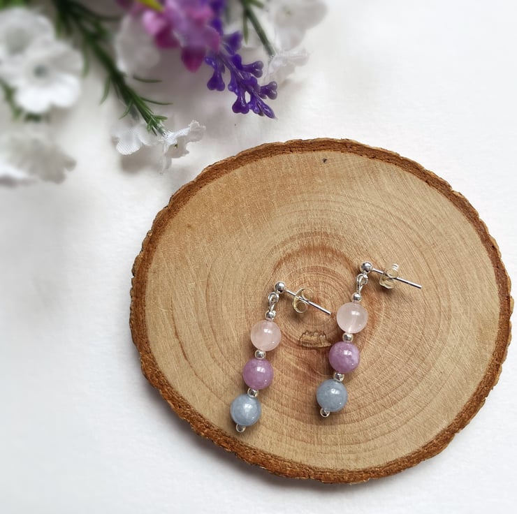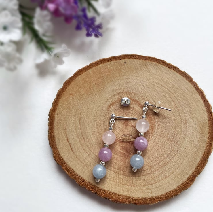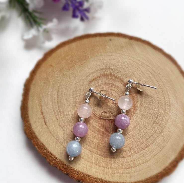 Add a pretty, pastel touch to your jewellery collection with these gorgeous rose quartz, amethyst and aquamarine gemstone beaded drop earrings.