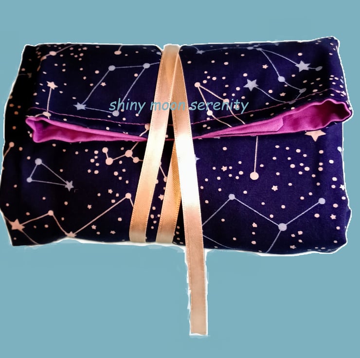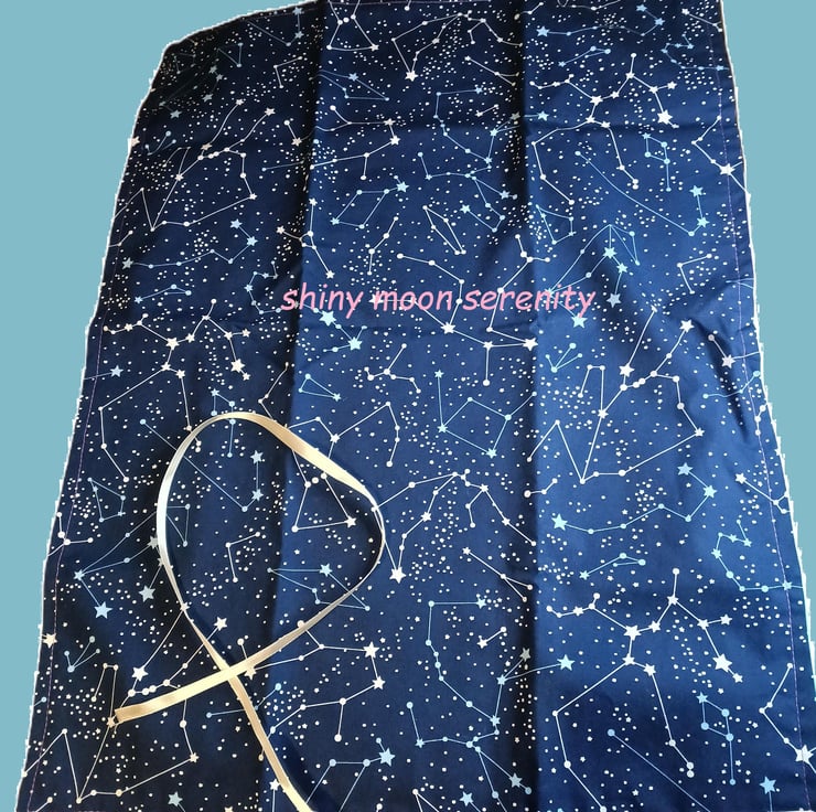 This is a flat mat with a printed fabric on one side and a plain fabric on the other. With a ribbon tie that wraps around the mat when it is folded around a pack of tarot/oracle cards. This will help to keep your cards safe when being transported.