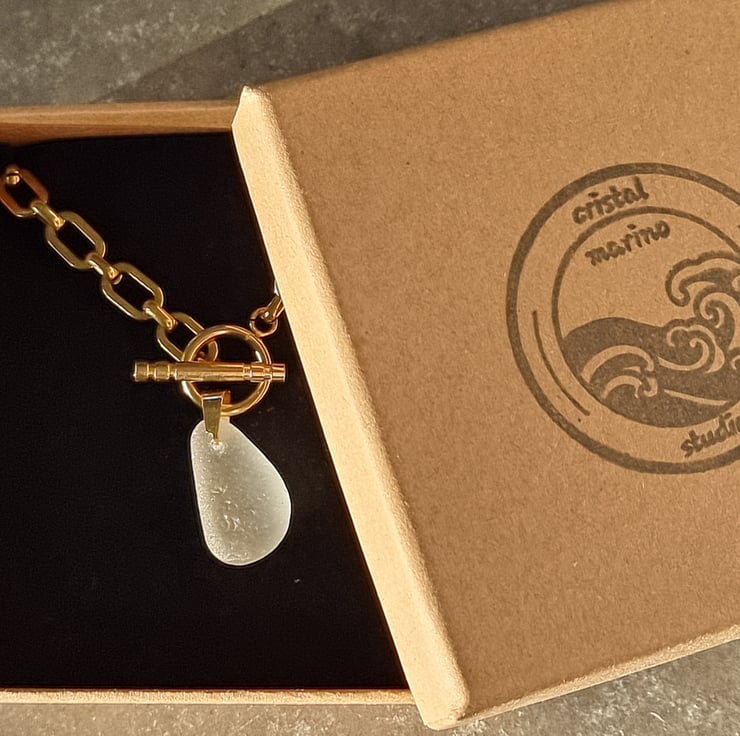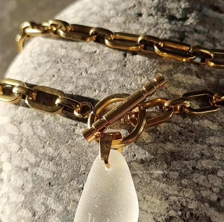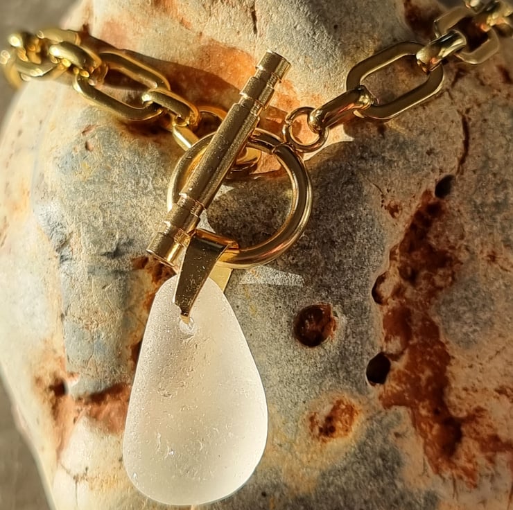 Hand made using a beautiful nugget of seaglass found on the North East Coast of England and paired with a chunky stainless steel gold-coloured chain and toggle clasp, this necklace is a unique and beautiful piece of jewellery.