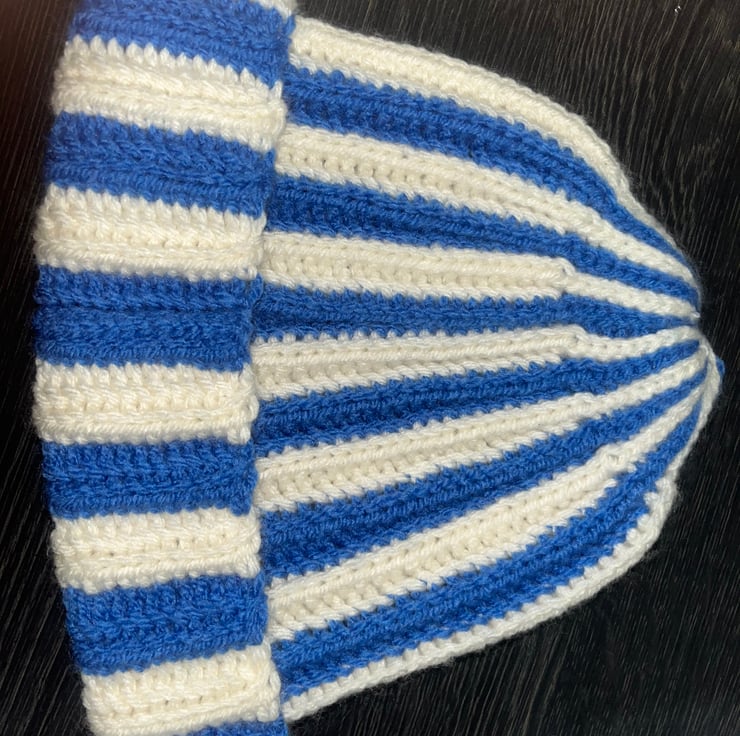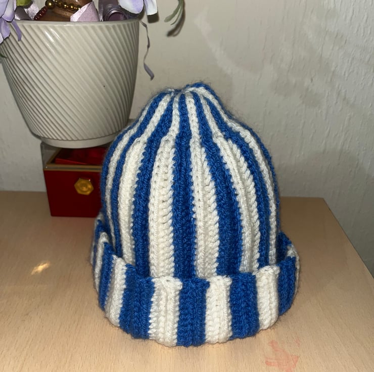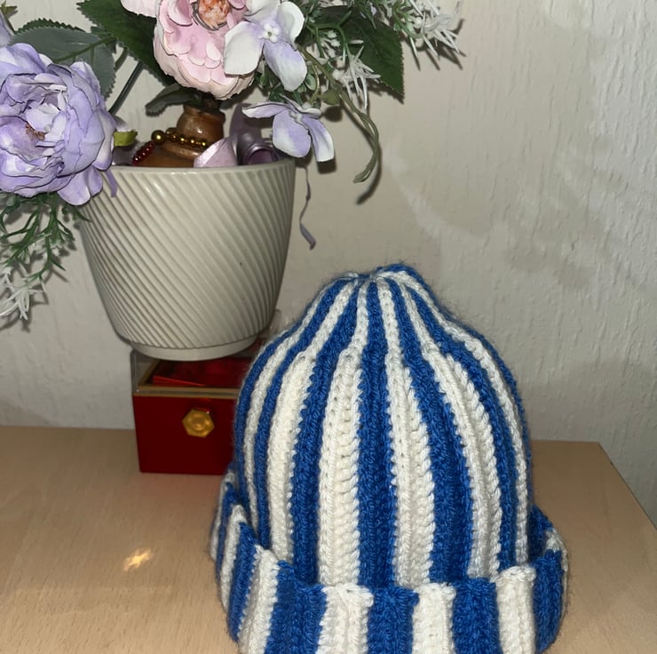 Stylish two-tone beanie, perfect for ladies on-the-go. Soft, chunky knit in a bold colour block design, the tow colours are blue and white which are nice combination.