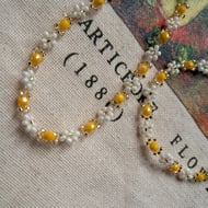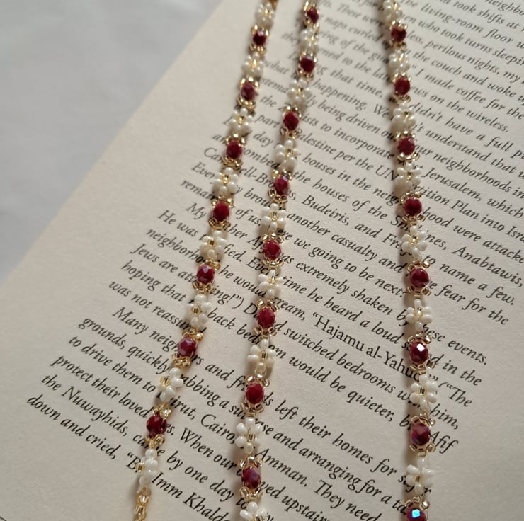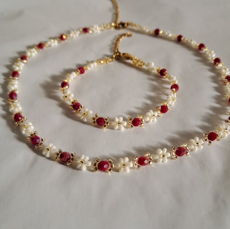 This necklace and bracelet set is carefully handcrafted using creamy white seed beads, deep ruby-red glass beads, and warm gold-tone accents arranged in a floral pattern.