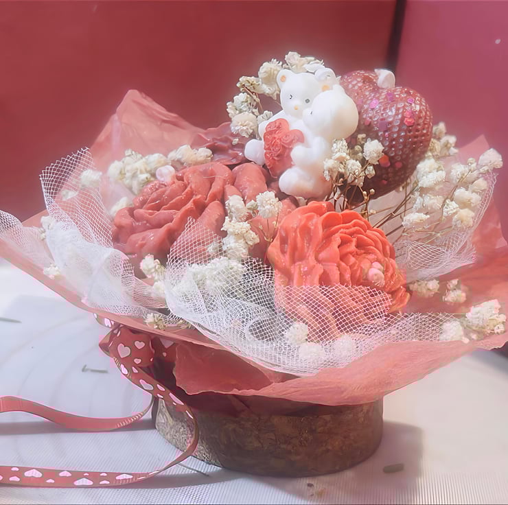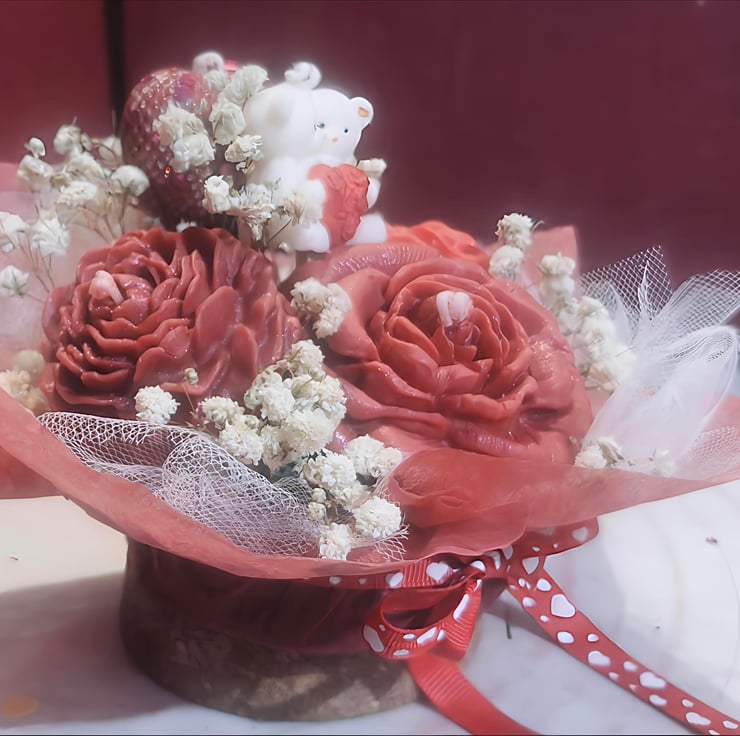 Celebrate love with this exquisite, handcrafted candle bouquet. Designed to look like a fresh floral arrangement, this unique piece features intricately detailed wax roses in a deep, romantic crimson, nestled among delicate sprigs of white baby’s breath.