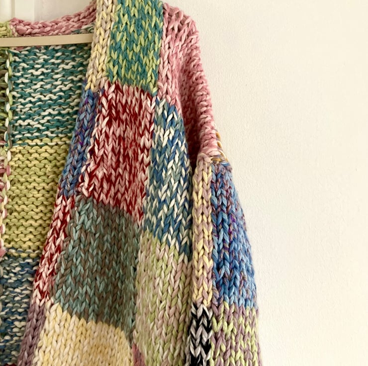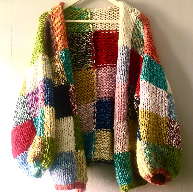 This came about during lockdown after a chance request from an old school friend asked if I could make a colourful patchwork cardigan for the summer festival season. It was perfect timing, I had a huge stash of yarns, all colours, all weights. It was a lucky experiment, I made a super chunky weight by mixing lots of different colours together resulting in a unique piece.
