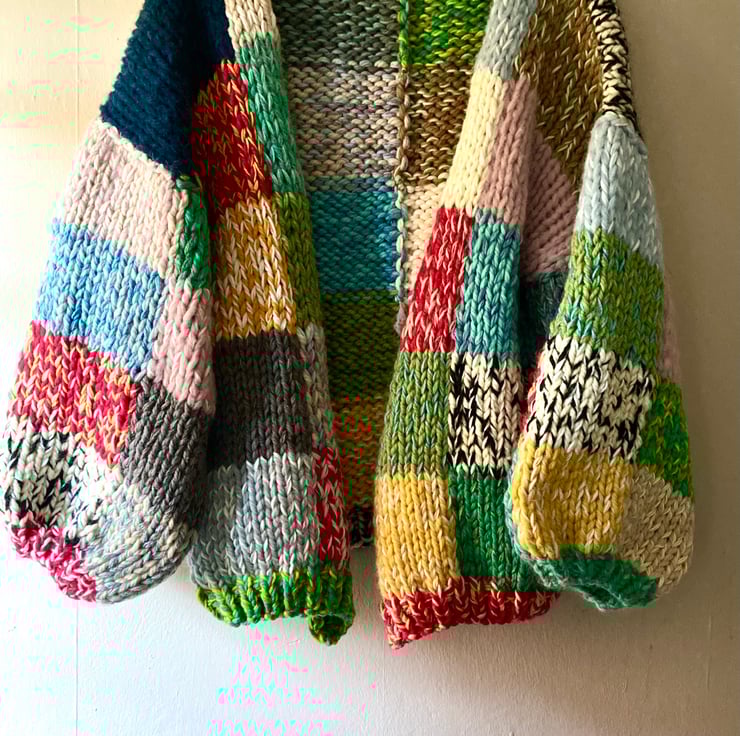 I have made nearly a dozen of these patchwork cardigans to order, both the long and cropped version, each one different depending on the yarns and colours used. The pattern allows you to experiment with yarns, and I am on hand to offer advice as you go.