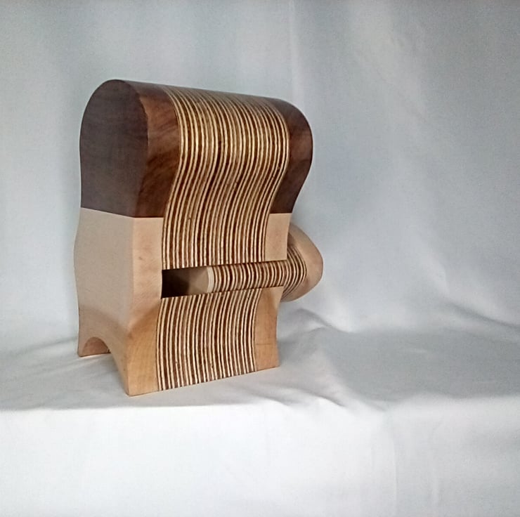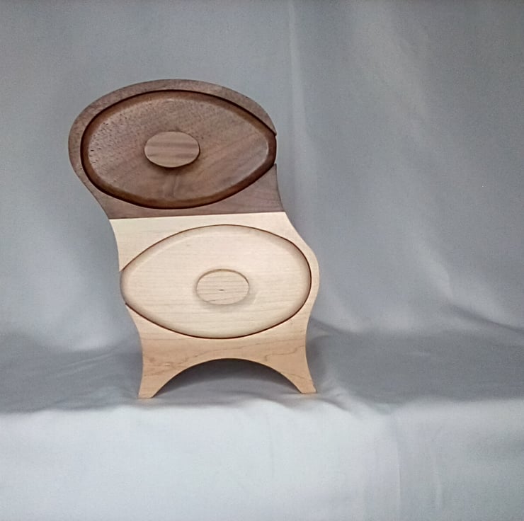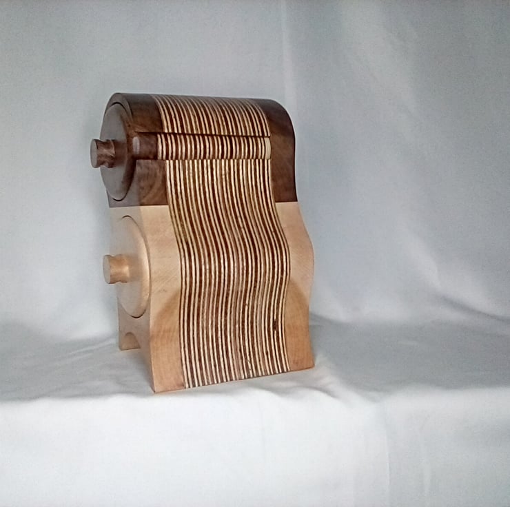 Bespoke hand made maple and walnut wobbly box with two large drawers perfect for jewellery or trinkets a perfect display piece for any room in the house finished in a natural wax standing 26cm high 20cm wide and 18cm deep