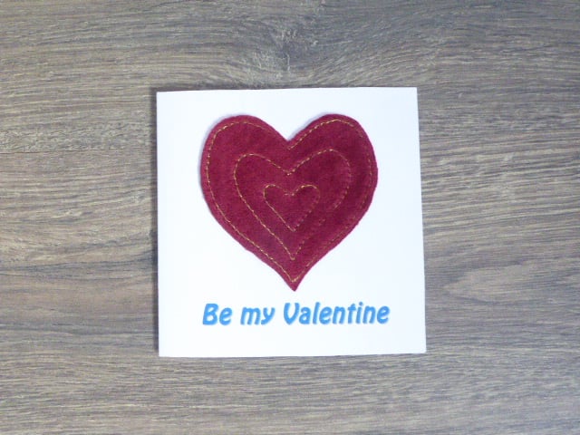 A gorgeous red velvet heart embellished with gold thread free motion embroidery, mounted on a white greeting card and completed with a printed quote - "Be my valentine"