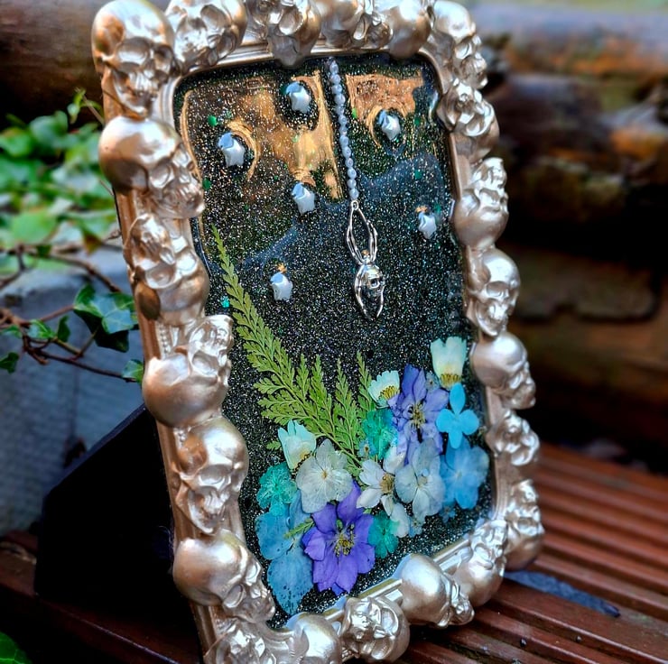 This upcycled gothic skulls photo frame (approximately 7 x 5 inches), has been intricately decorated by hand with a glittery black-green resin background, real dried flowers, holo glitter and charms.
