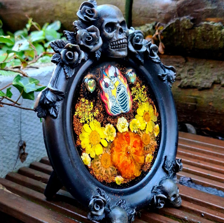 This upcycled gothic skulls photo frame (approx 6 inches in height), has been intricately decorated by hand with a glitter resin background, real dried flowers and charms.