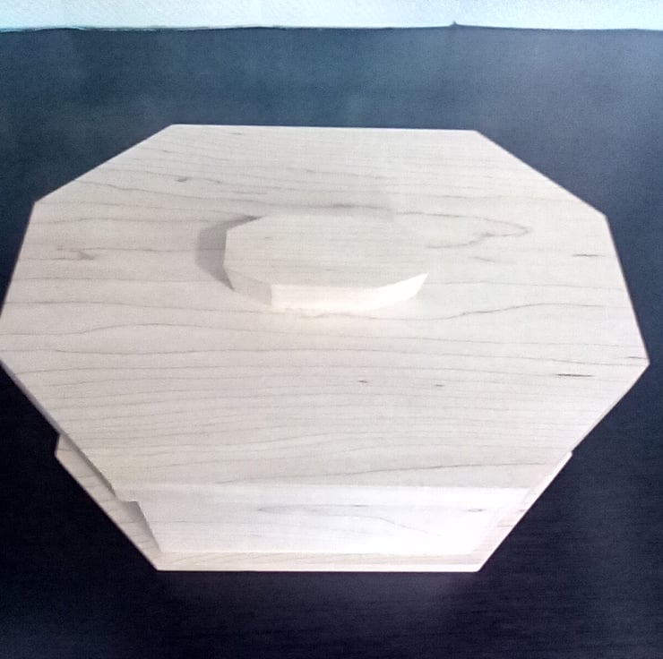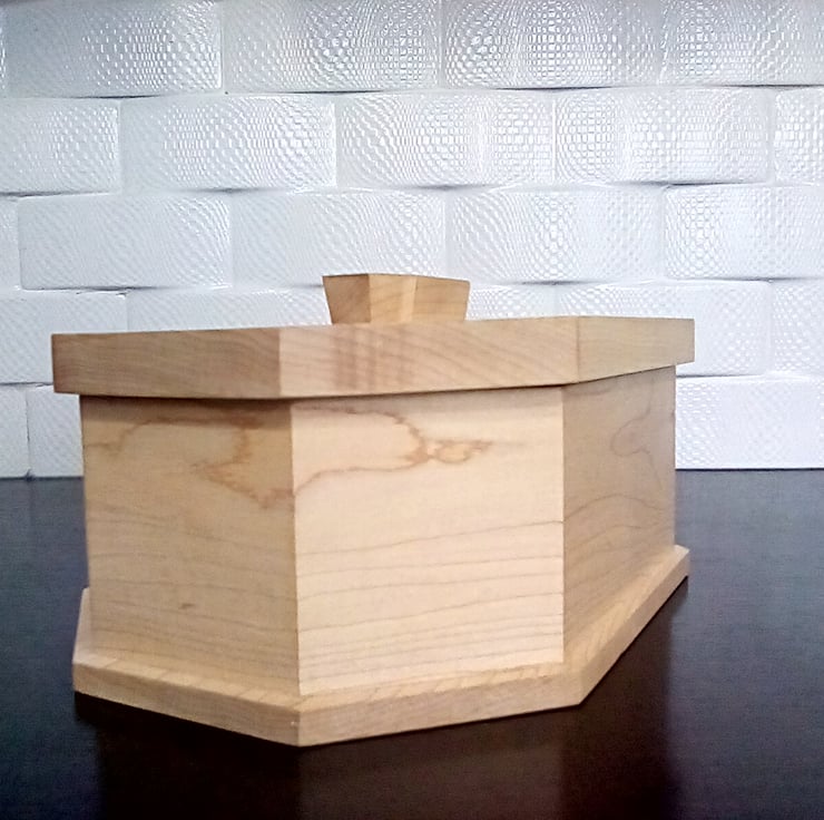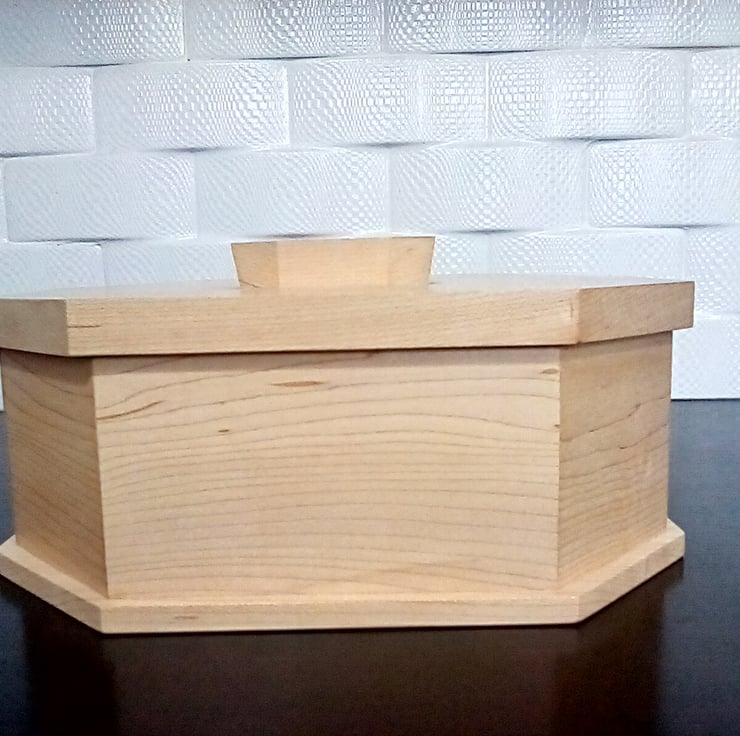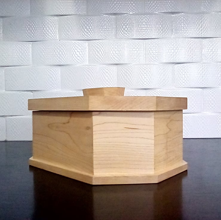 Bespoke hand made maple storage box all hand cut joints made from hard maple its hexagon shape give it a distinctive style it is a very heavy item the lid is cut from a single piece and debated for a perfect fit using it shaped handle standing 24cm wide 17cm deep and 11cm high