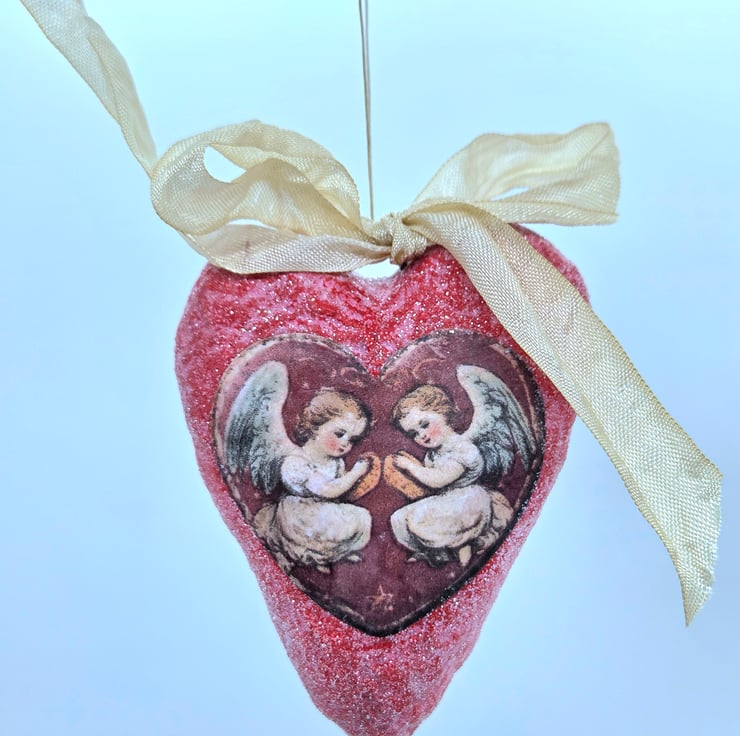 This pretty pink and red spun cotton heart Valentine’s ornament is adorned with a pair of cupids and a cream-coloured crinkle ribbon bow. The ornament is about 8cm tall.