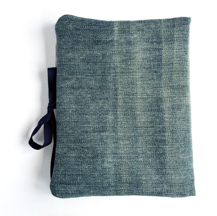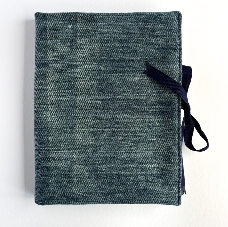 The cover is closed with a dark blue ribbon.