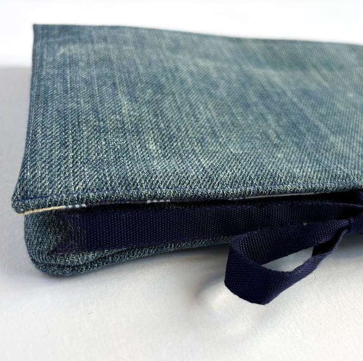 The cotton lining is a lovely check of blues and oranges. This is complemented by an upcycled denim exterior.