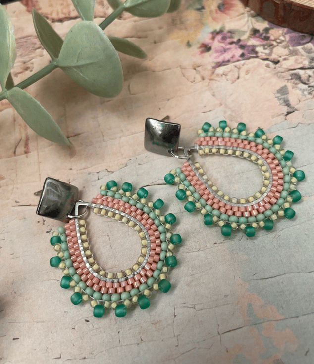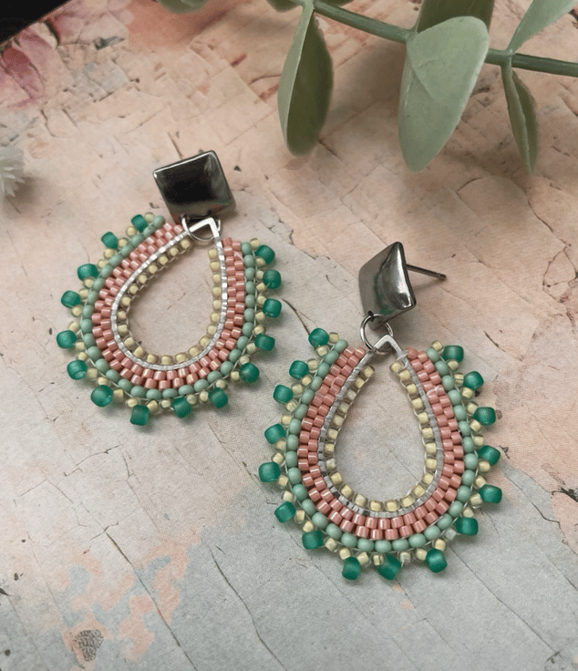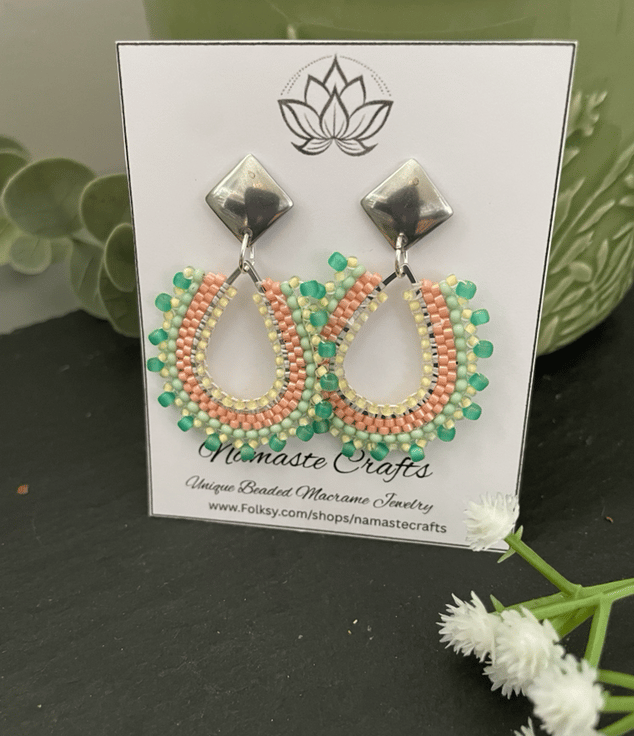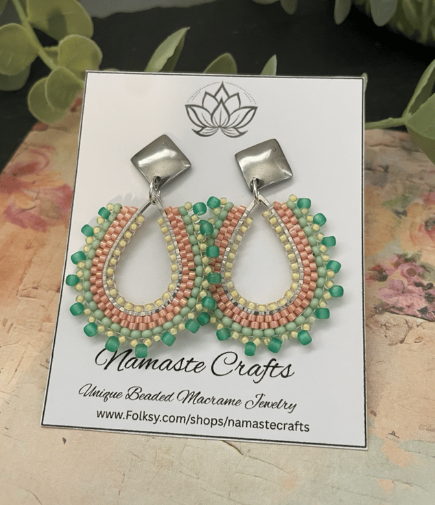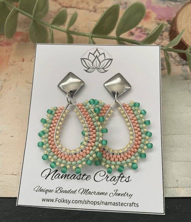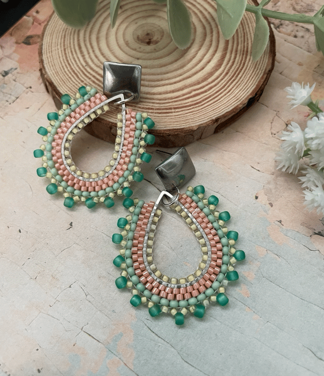 Parallel rows of Czech glass seed beads have been hand woven to outline the silver teardrop shape creating a beautiful pair of earrings that encompasses handcrafted, one-of-a-kind beauty ready to gift to that special person or to keep.
