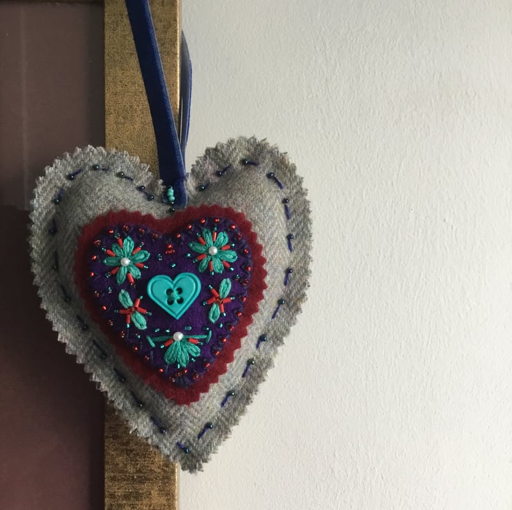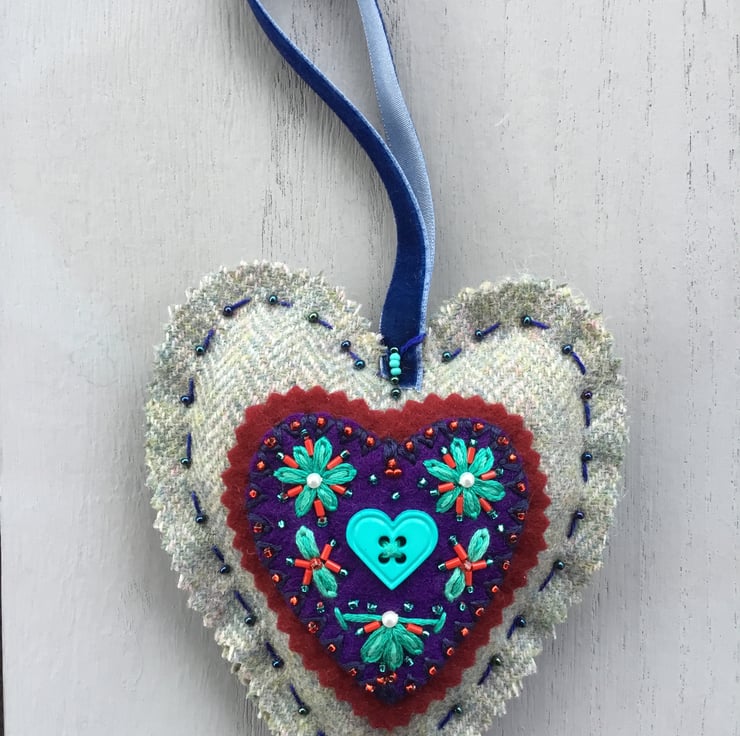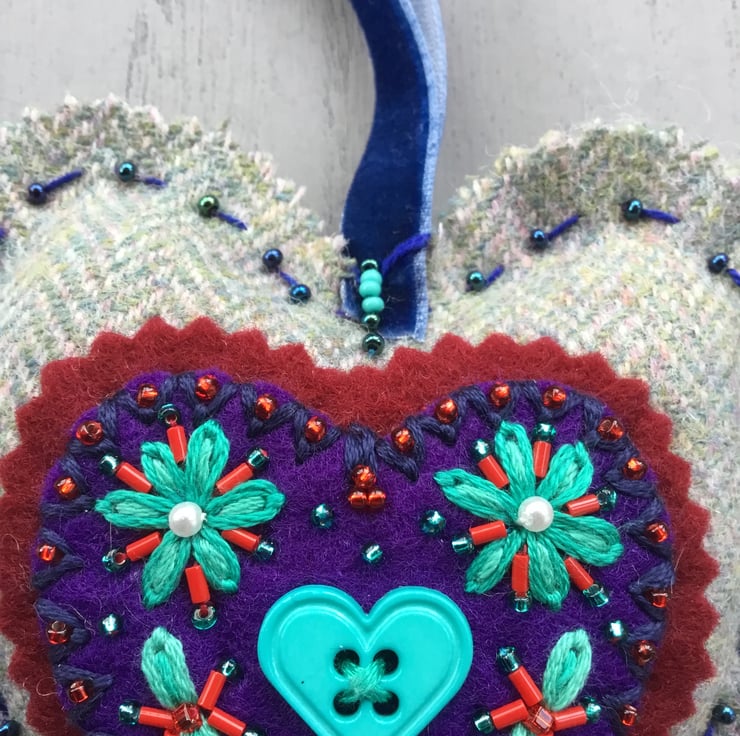 This Hand Embroidered Berry Blue Heart Hanging Decoration has a heritage feel to it, as it’s made out of Herringbone wool fabric. Two wool felt Heart shapes in berry red and dark blue are sewn onto pale blue Herringbone fabric. A turquoise Heart button is sewn in the middle. Flowers are hand embroidered around this Heart button, decorated with pearl, red and turquoise small bugle and seed beads. Blue Running Stitches and blue beads edge this padded Heart.