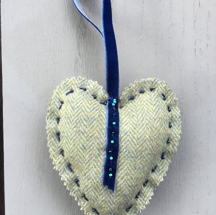 A blue velvet ribbon is secured at the top with beads….. a long hanging loop to hang this Hand Embroidered Heart in the home, over a picture frame, a door handle, a coat hanger or, as a decorative Heart on the wall. It’s 4 inches in diameter and length.