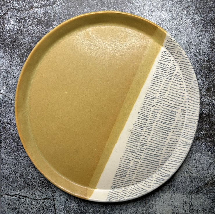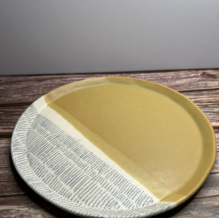 Hand made and decorated dinner plate. Made in Brighton UK. Yellow ochre with drawn lines. Diameter 22.5cm and height 1.5cm. Versatile and can be used as a plate or serving dish.