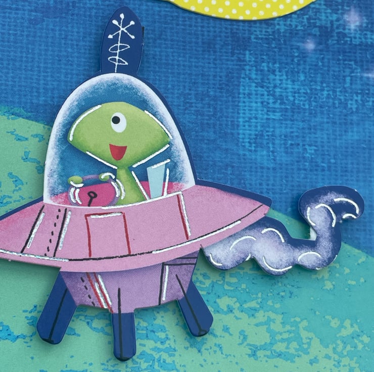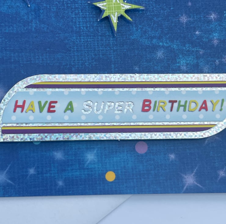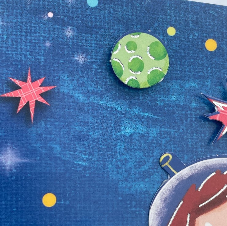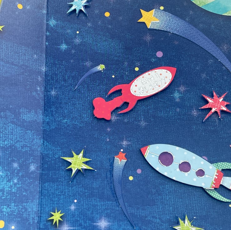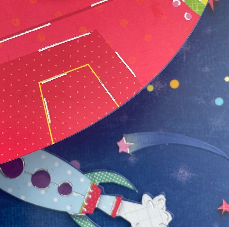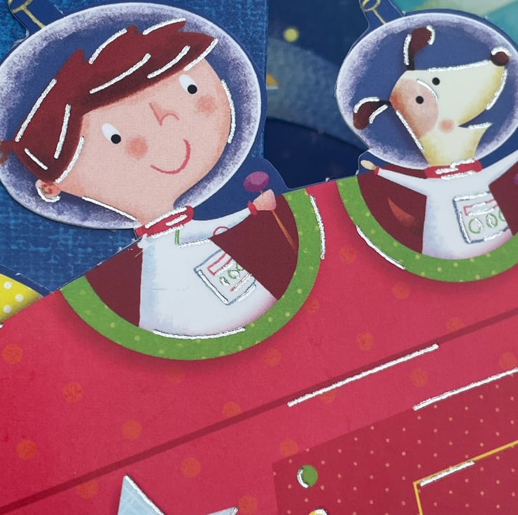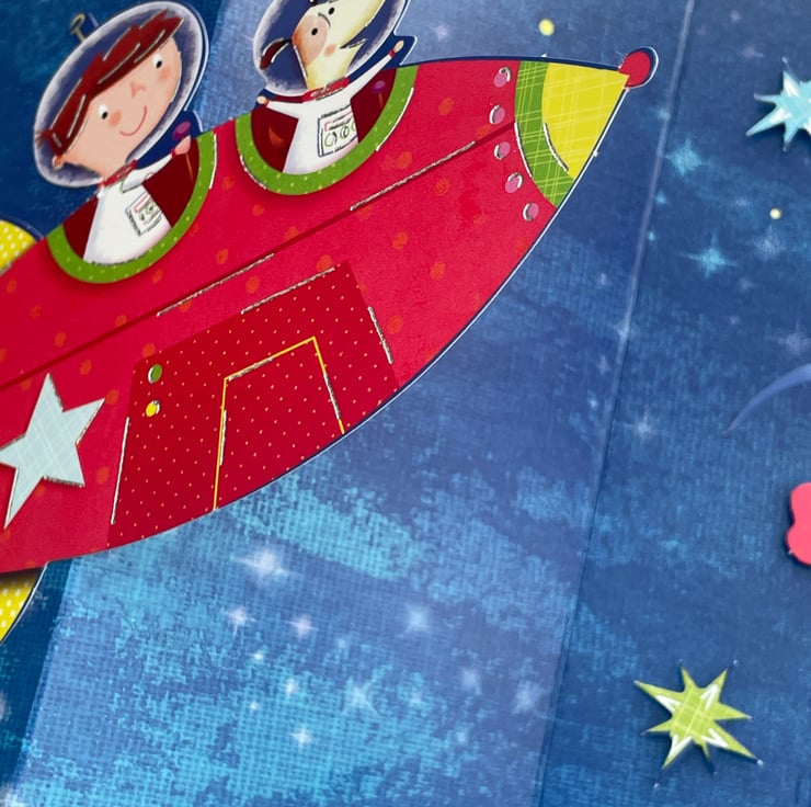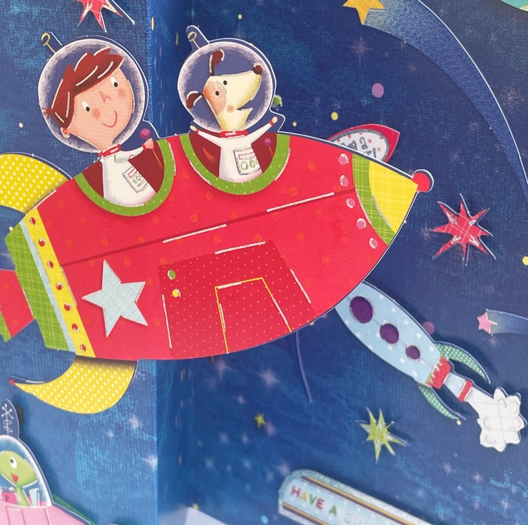 A cute and fun space themed birthday card. This A5 sized card is so cute. It features a front fold back design of the space themed card, this has planets and stars on it. The main feature is a large colourful rocket ship with 2 passengers - a cute boy and his dog. This is flying through space passing a watching but cute alien, lots of stars, more rocket ships and shooting stars. The greetings are Have a blast which is on one of the rockets ans Have a super birthday. Fun and colourful for a keen spaceman.