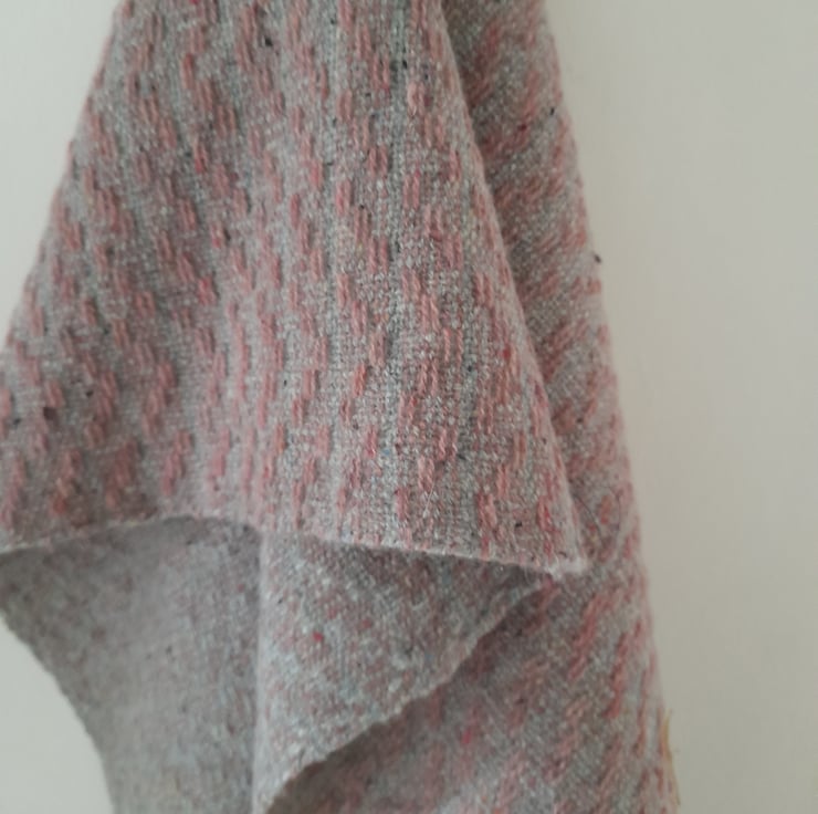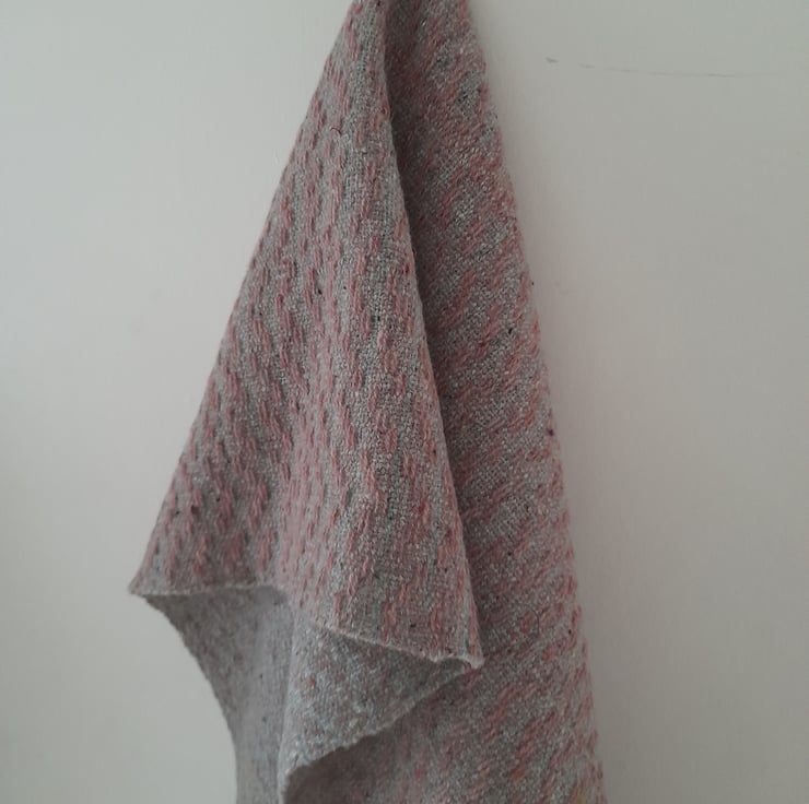 I was keen to make this scarf for the colours of grey and subtle pink which reflect the soft skies we sometimes get in north Lancashire, on the fells in the winter. I also wanted to see if the recycled yarn, made from wool shoddy mixed with some cashmere, would blend well with wool yarn from local Ryland sheep.
