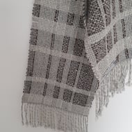 This handwoven scarf, with a lovely drape and soft colours has been woven from local Ryeland wool, recycled wool and indigo own dyed wool.