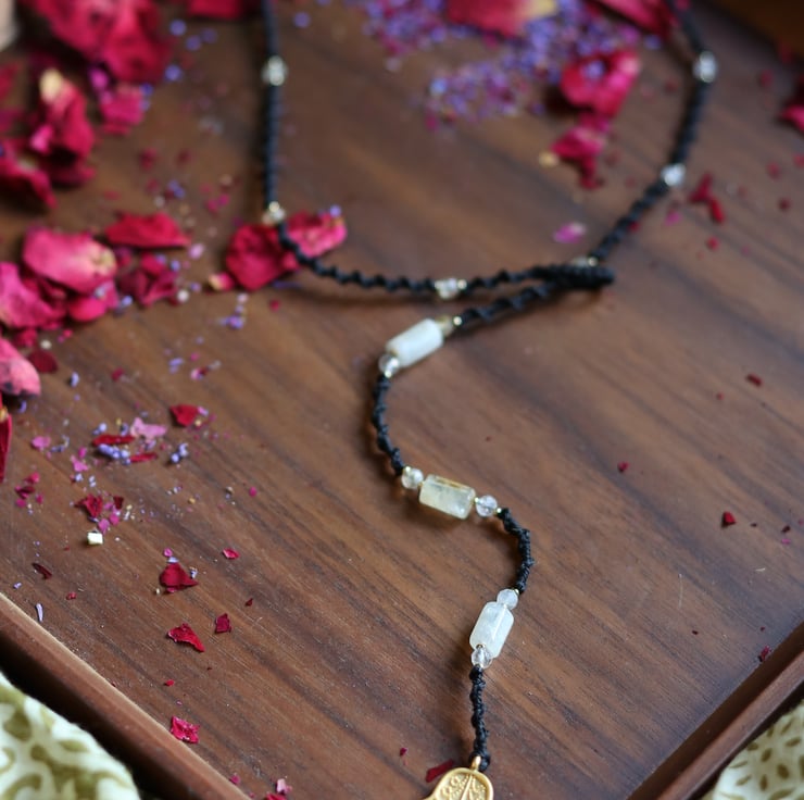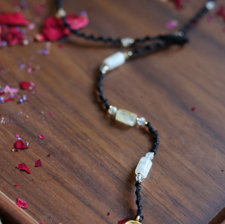 Macrame wrap necklace in black with Natural stone Citrine and brass Hansa hand