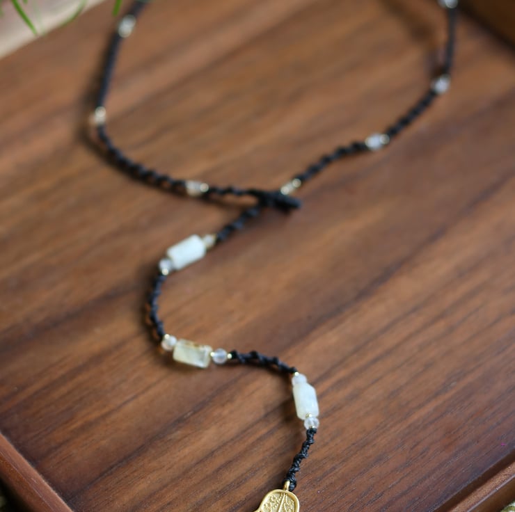 Macrame adjustable wrap necklace with citrine in black with brass Hansa hand .
