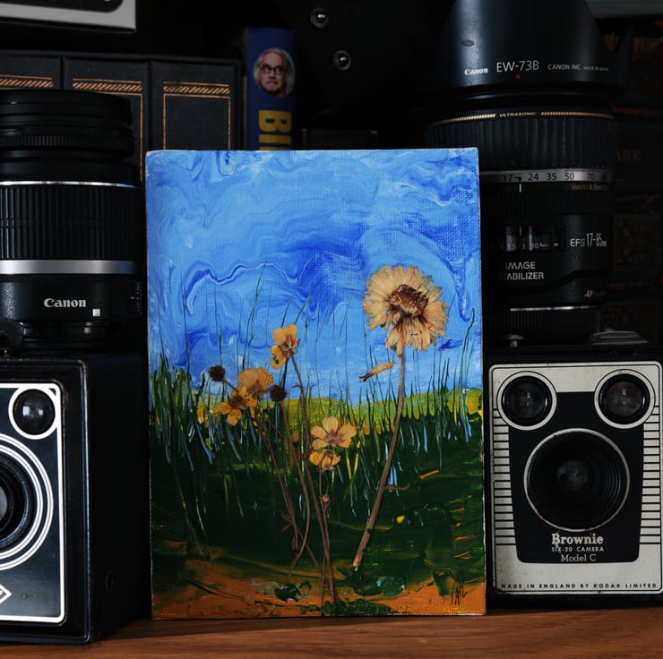 Acrylic paint and dried flowers.