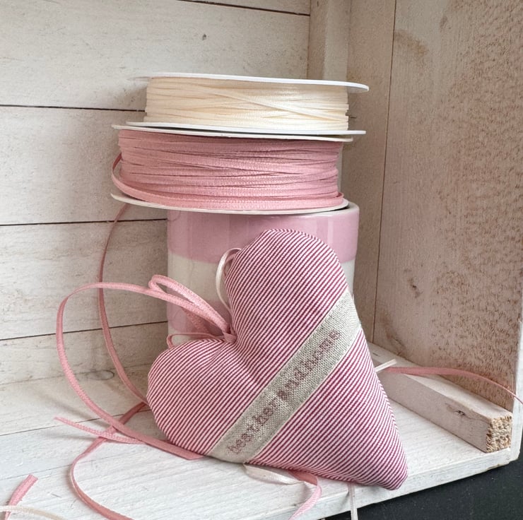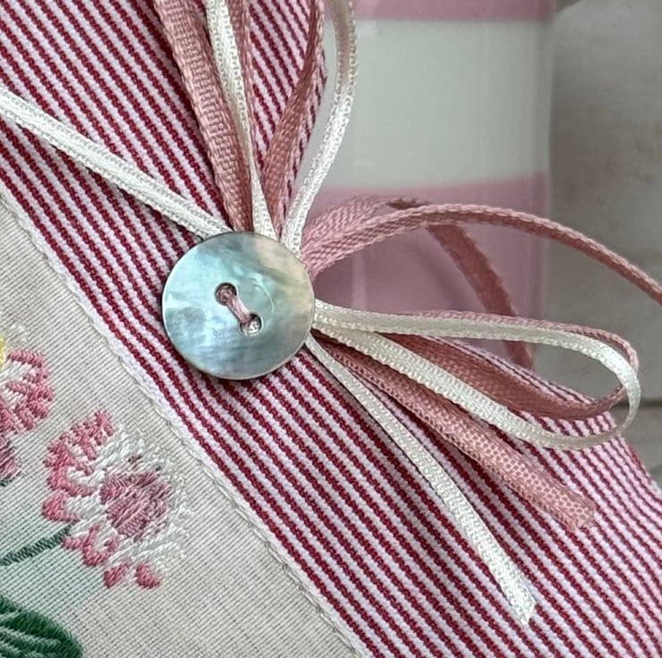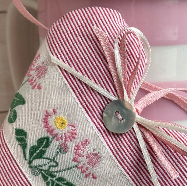 Generously filled with gloriously fragrant and locally grown Hampshire lavender (or with hypoallergenic wool toy stuffing), and finished with a shimmery mother-of-pearl round button, double ivory and pink ribbon bows and pink hanging ties, and with a linen 'heatherandhome' label on the reverse side.