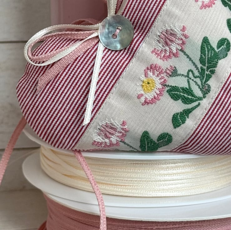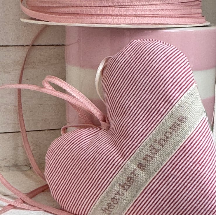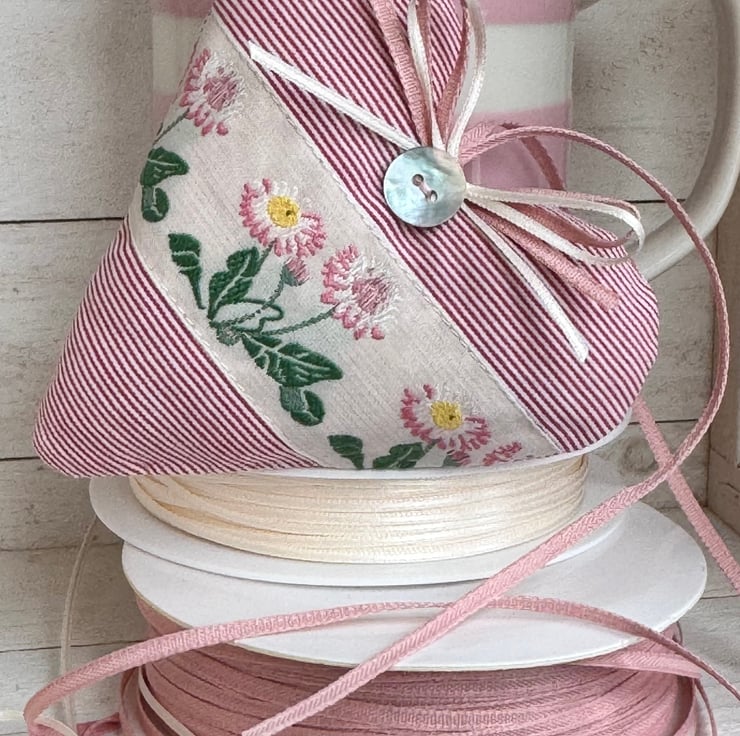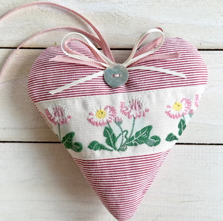 This February heart has narrow raspberry pink and ivory stripes and a pretty woven ivory ribbon featuring beautiful wild daisies in shades of pink and white, with vibrant green leaves.