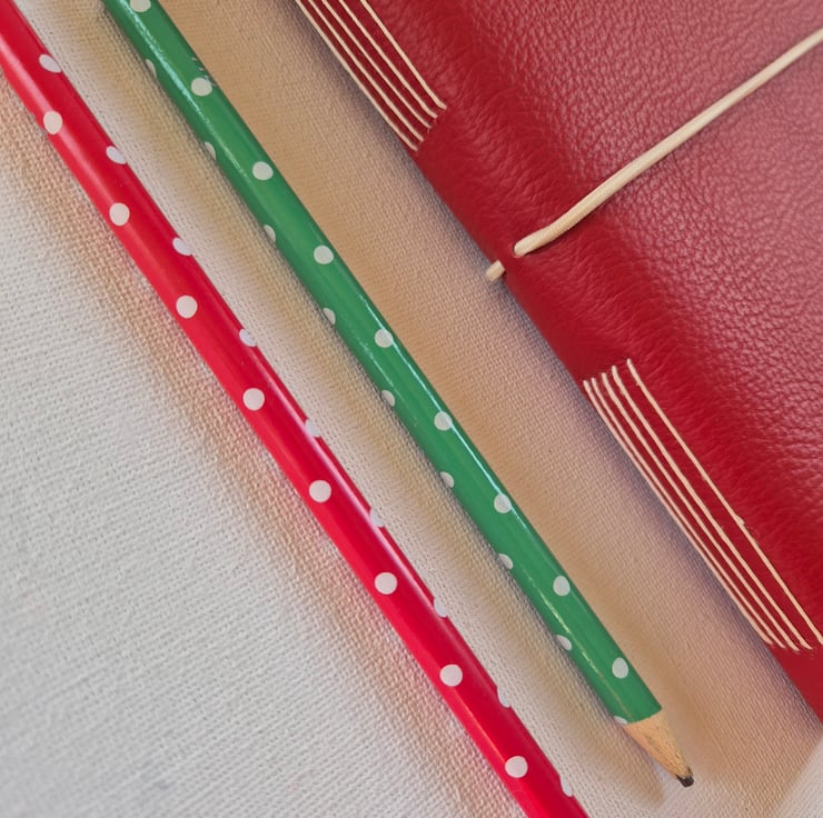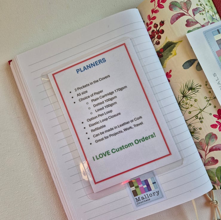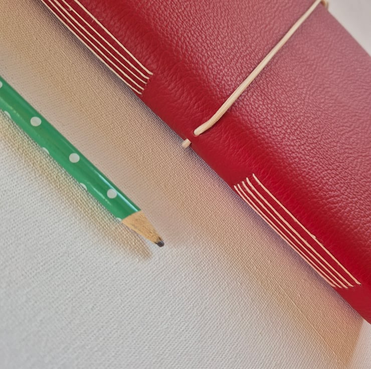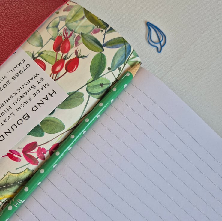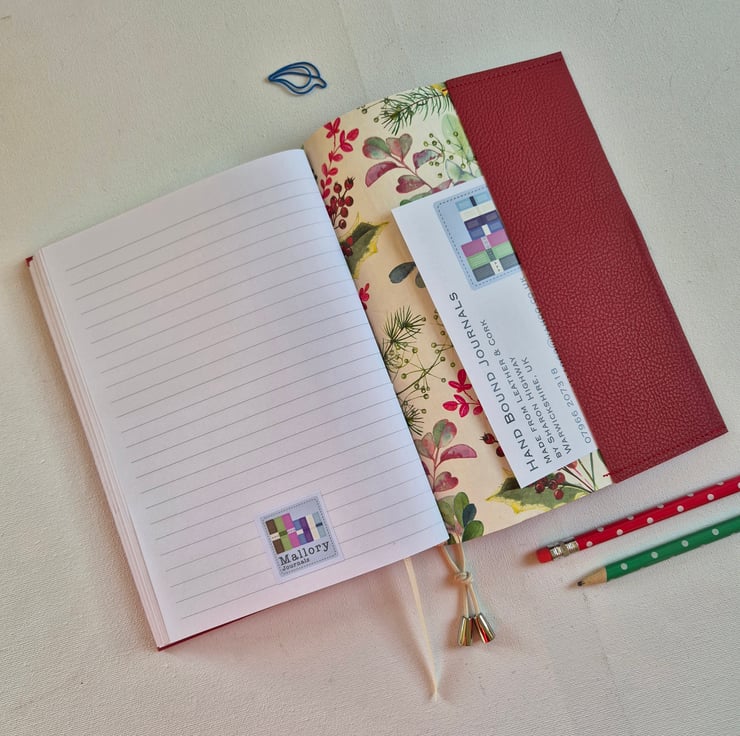 Hand Bound with Red Italian Leather and lined with a lovely garden plants paper. There are pockets in the front and back of the Journal and it is closed with an Elastic Loop pulled over the Journal. There is a handy Ribbon Page Marker and the Journal lies completely flat when in use. There is an option to have a Pen Loop too.
