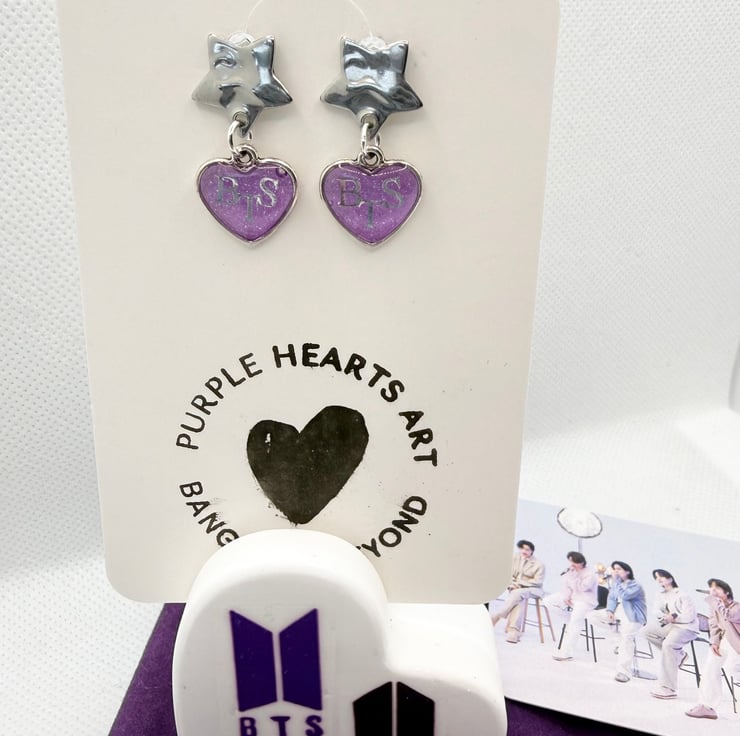 A cute pair of heart earrings to express your love for BTS! made from steel & resin, in purple shimmer. They are also available with silver star attachments, for pierced ears. Each pair of earrings will arrive in a purple velour pouch.