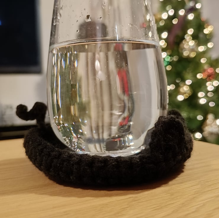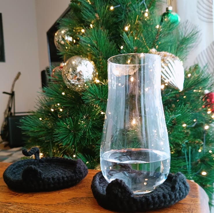 Add a little feline charm to your coffee table with this adorable set of handmade black cat crochet coasters.
