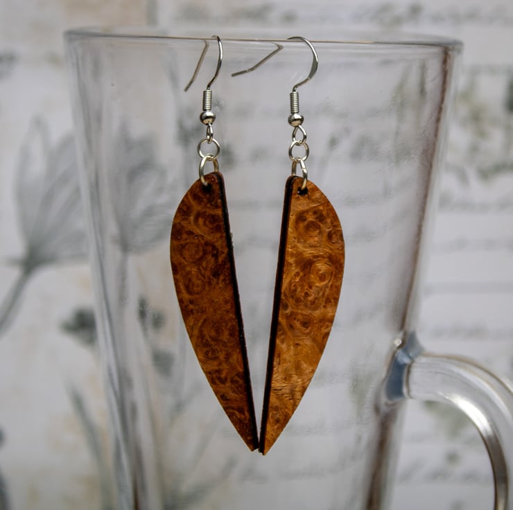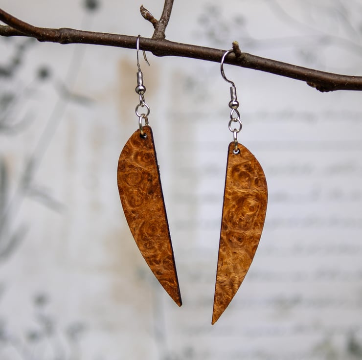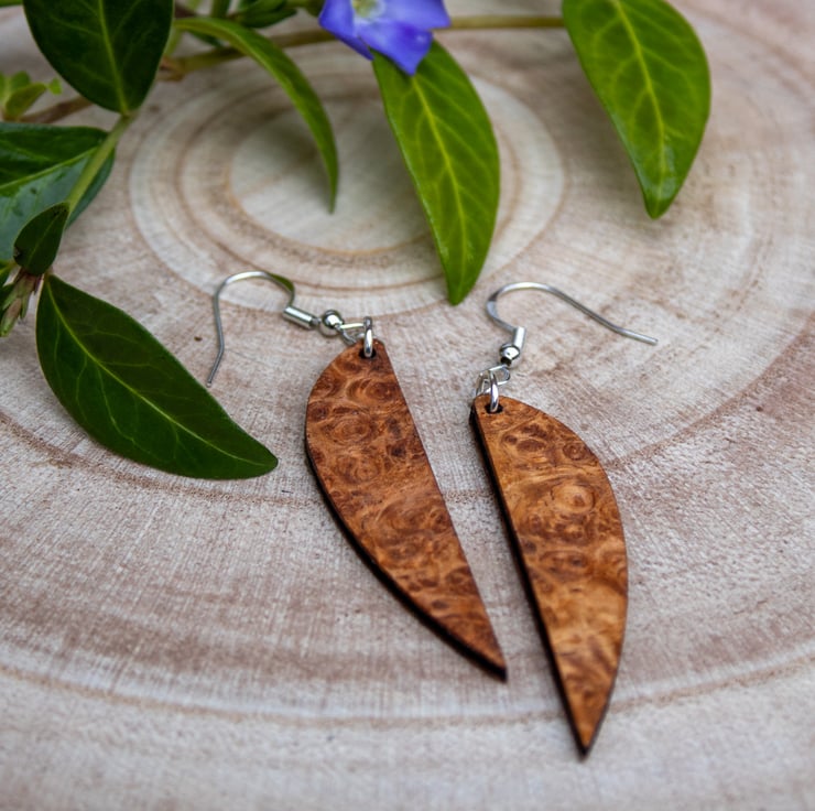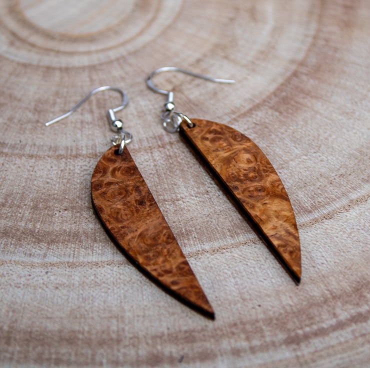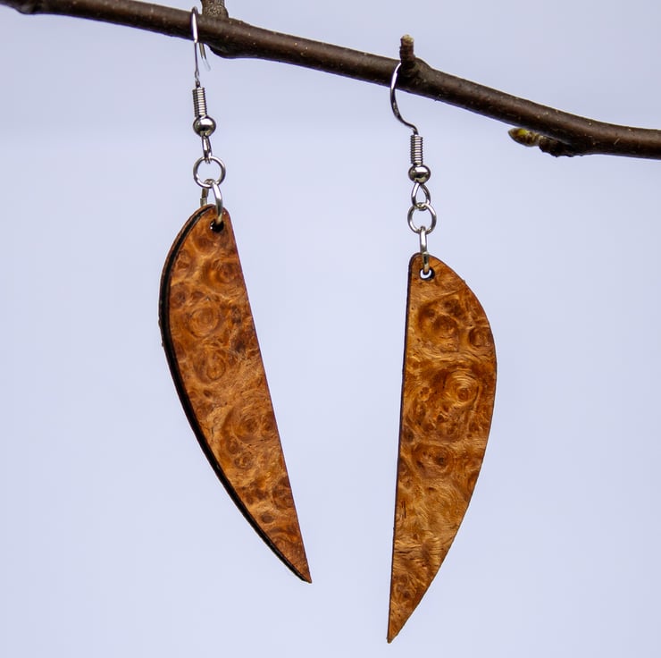 I choose this elegant `sling` shape to give the earrings a sense of fluidity and movement, almost like sails catching the wind. By using my laser, I can achieve the perfect balance between this organic, ancient material and sharp, modern design. Every pair is hand-finished with care to ensure that the natural story of the wood shines through.