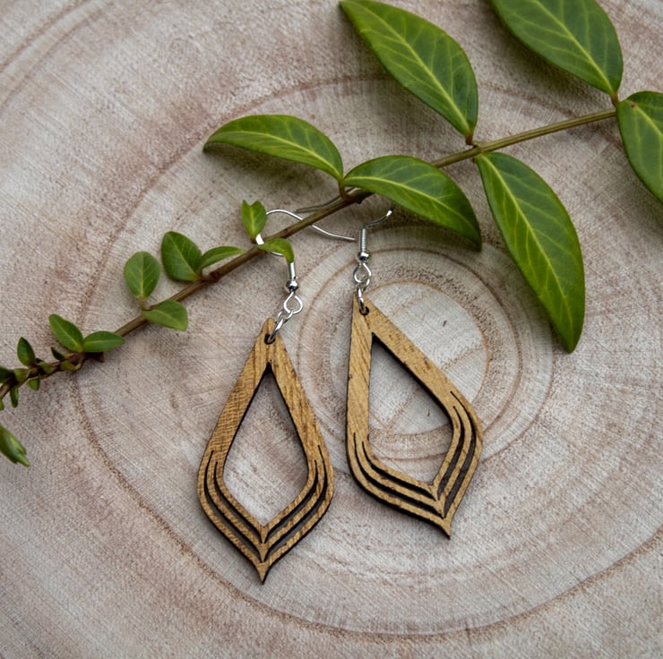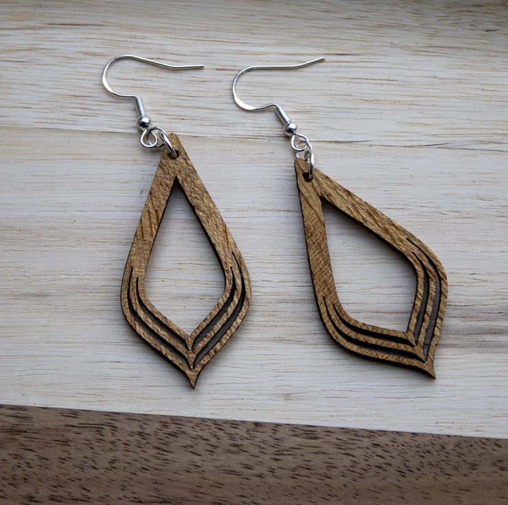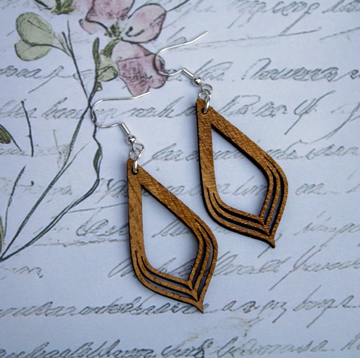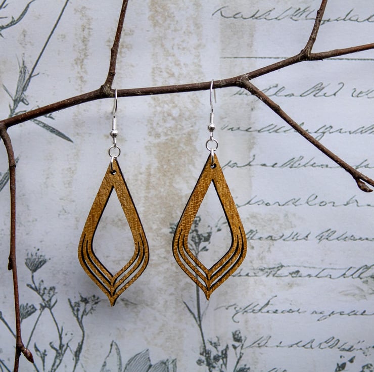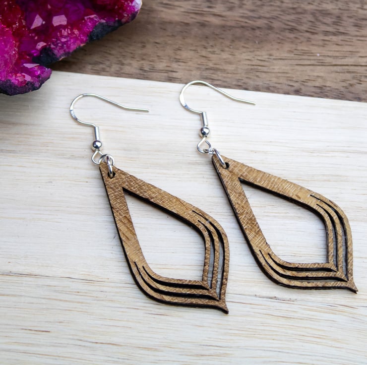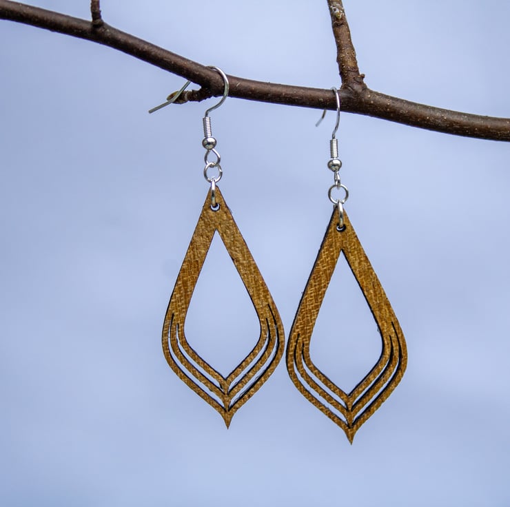 Elevate your style with these stunning geometric drop earrings, handcrafted from rare Gold Silk Wood. This timber is prized for its extraordinary luster and fine grain that catches the light like shimmering silk fabric.