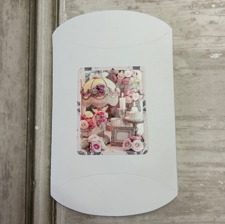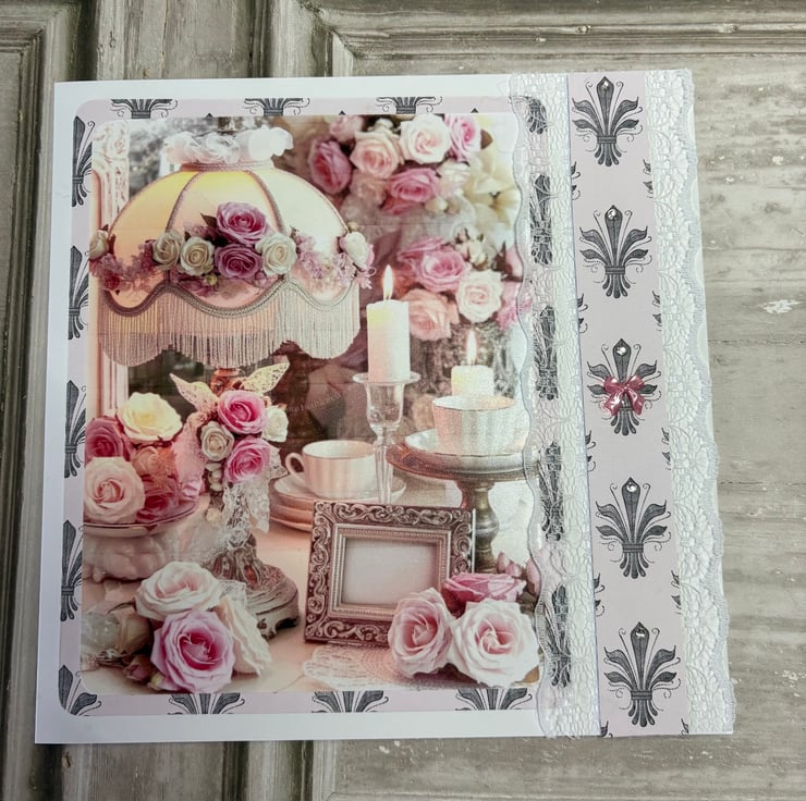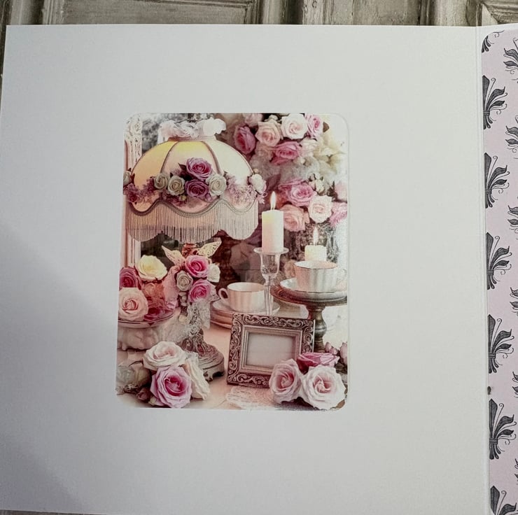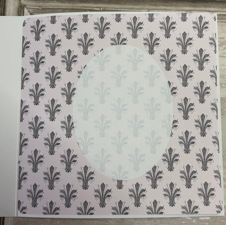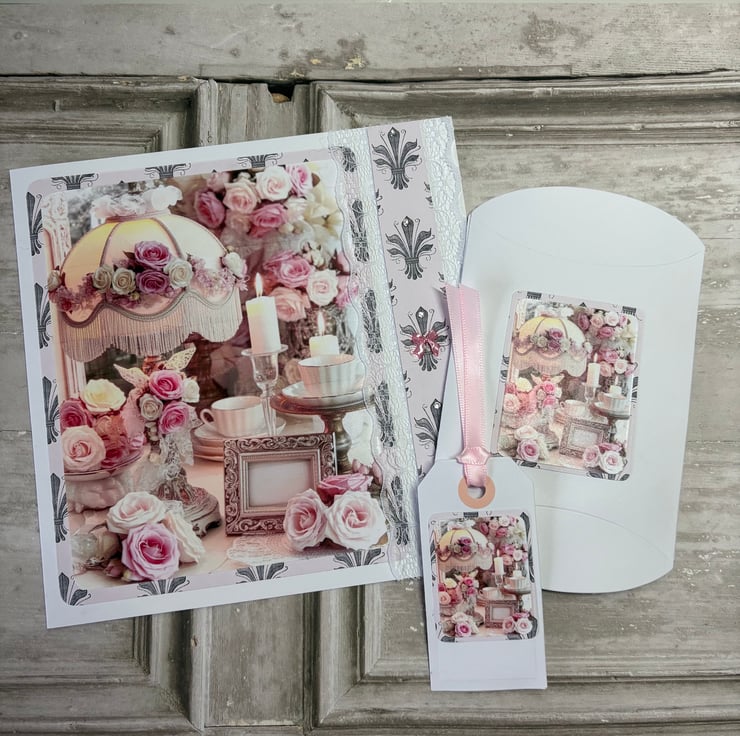 Gift Wrapping Set - Paris Afternoon Tea - 7" x 7' blank greeting card, pink and black Fleur de lis backing paper with a topper printed onto satin photo card. Edged with lace and a flour de lis paper strip with diamantés and a pink bow in the centre. Duplicated matching image on the inside of the card. A printed flier de lis background with a white oval for your own message. Envelope pouch to hold a small gift with a matching topper. Measures 3.5" X 3.5".Tag with matching design to add to your gift. Measures 3" x 1.5".