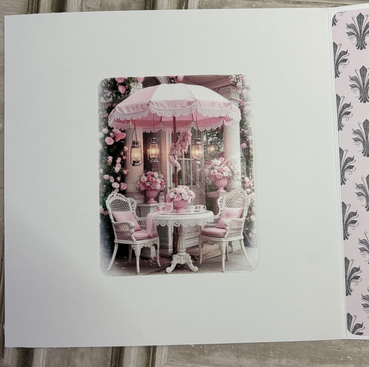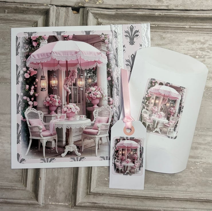 Gift Wrapping Set - Paris Afternoon Tea - 7" x 7' blank greeting card, pink and black Fleur de lis backing paper with a topper printed onto satin photo card. Edged with lace and a flour de lis paper strip with diamantés and a pink bow in the centre. Duplicated matching image on the inside of the card. A printed flier de lis background with a white oval for your own message. Envelope pouch to hold a small gift with a matching topper. Measures 3.5" X 3.5".Tag with matching design to add to your gift. Measures 3" x 1.5".